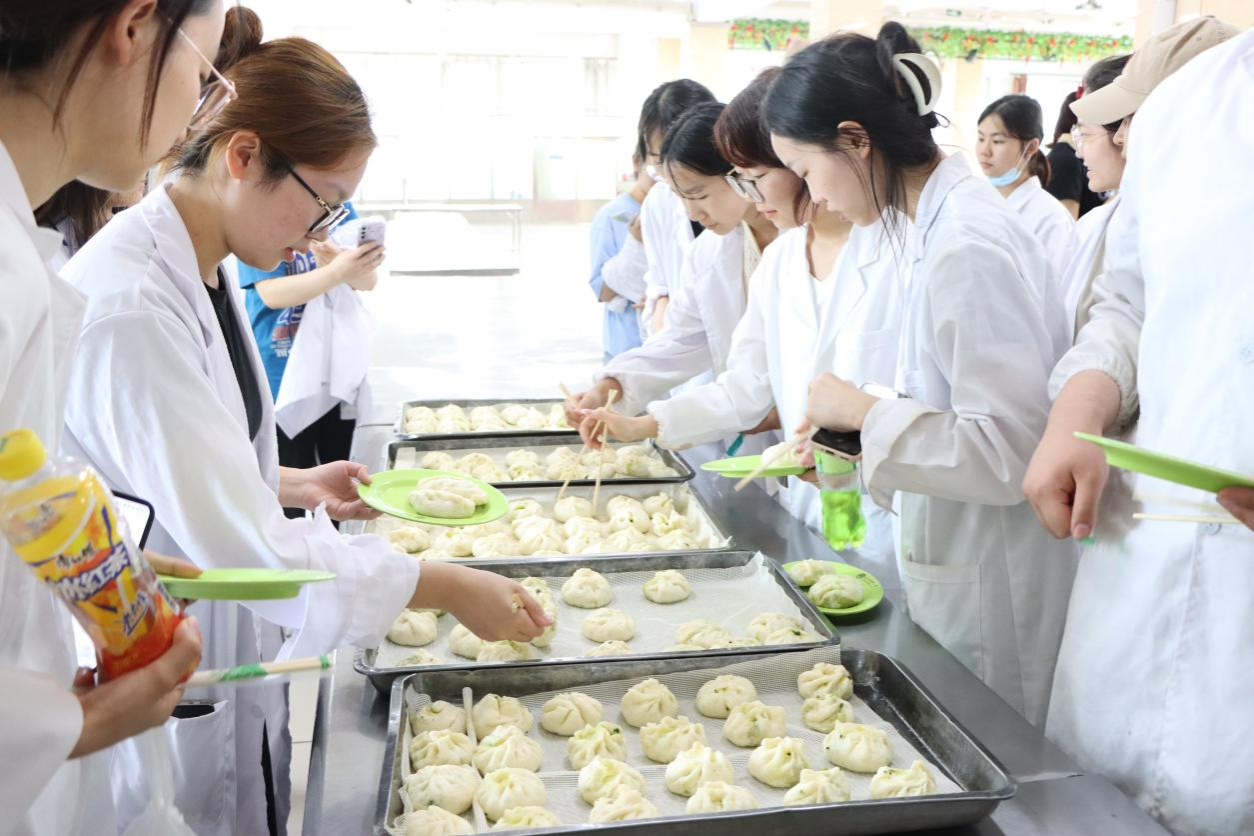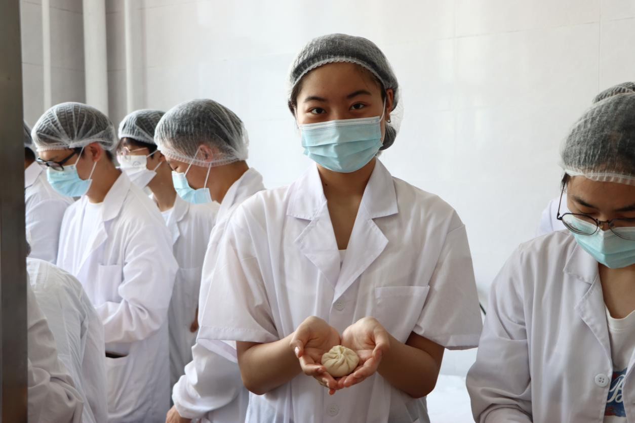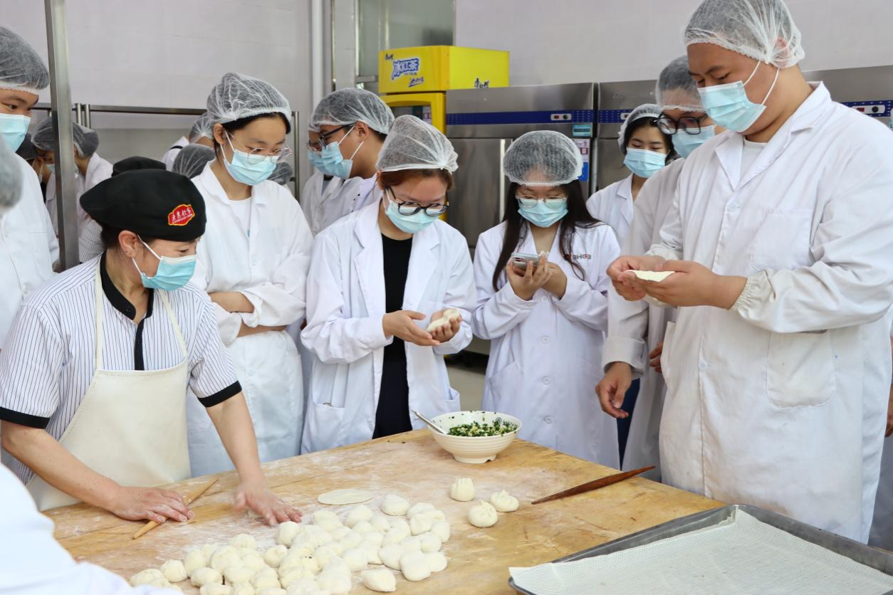 本次活动地点为北区学生第三食堂,食品学院粮食工程专业4个班级同学在食堂工作人员带领下,对食堂的采购进货、库房存储、主副食加工、出餐流程等运营情况进行了现场观摩。观摩结束后,师生在面食间开展实践,亲手体验包子的制作,并在蒸制后进行品尝。