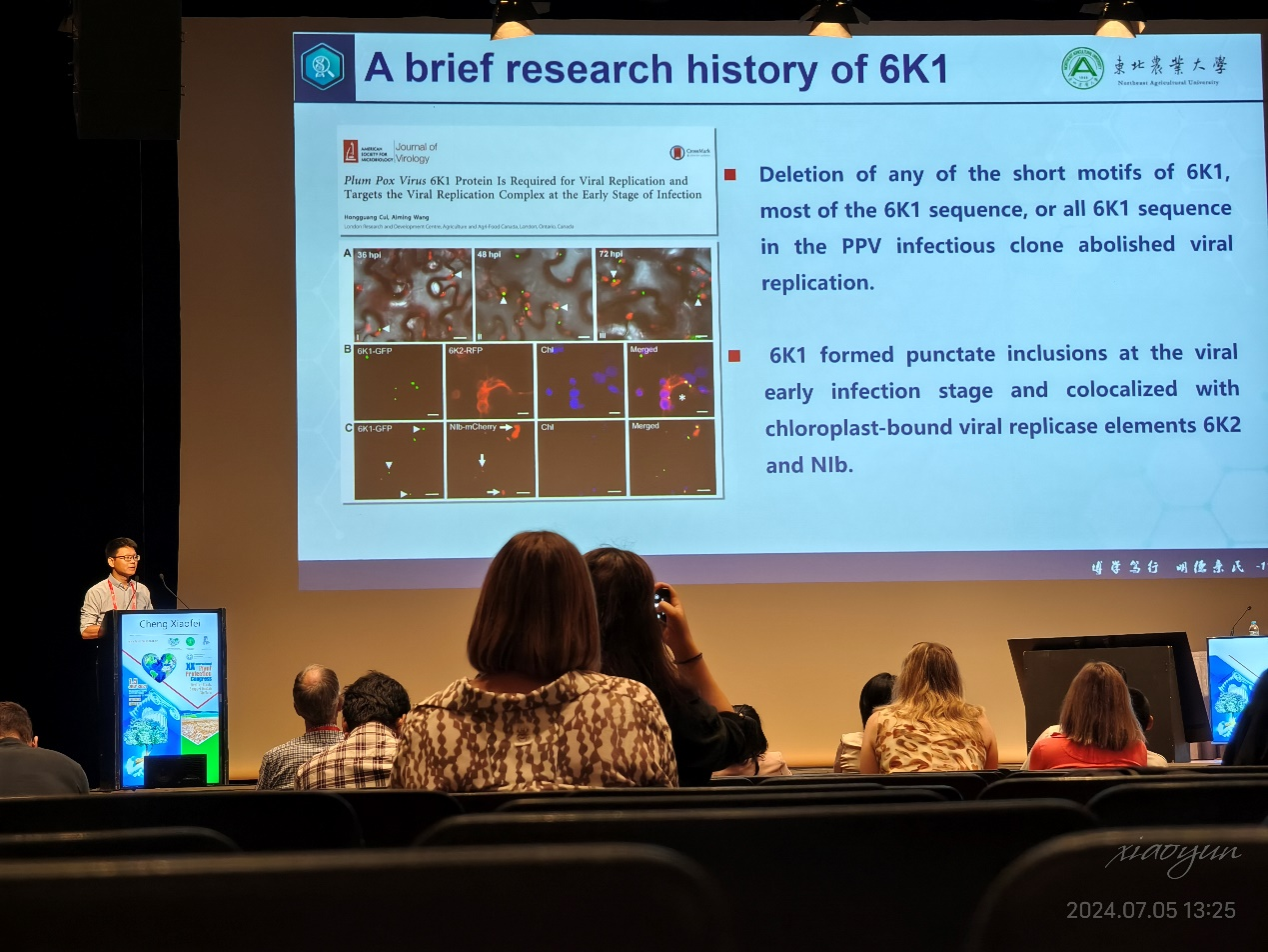 程晓非作题为《The 6-kilodalton 1 (6K1) of potyvirids is a viroporin》的大会研究报告,分享了团队最近发表于美国国家科学院院刊《PNAS》上的研究成果,该成果首次在植物病毒中发现病毒孔蛋白(viroporins),报告得到了同行专家的热烈反响和积极反馈。