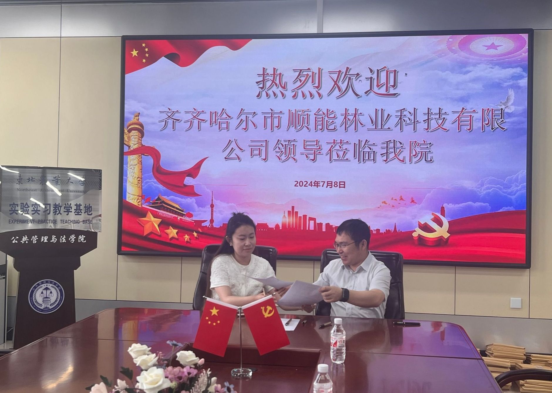 为全面加强学院与企业的科研合作和人才培养,7月8日,公共管理与法学院与齐齐哈尔市顺能林业科技有限公司在会议室举行战略合作签约仪式。学院院长杜国明,副院长黄善林,土地整治工程系主任李全峰,副主任马辰,教学秘书于潇洋,齐齐哈尔市顺能林业科技有限公司法人于岩,联系人季子淳等参加签约仪式。