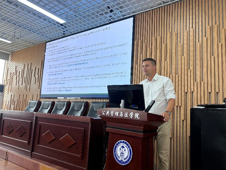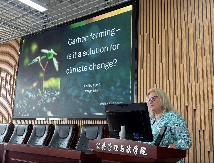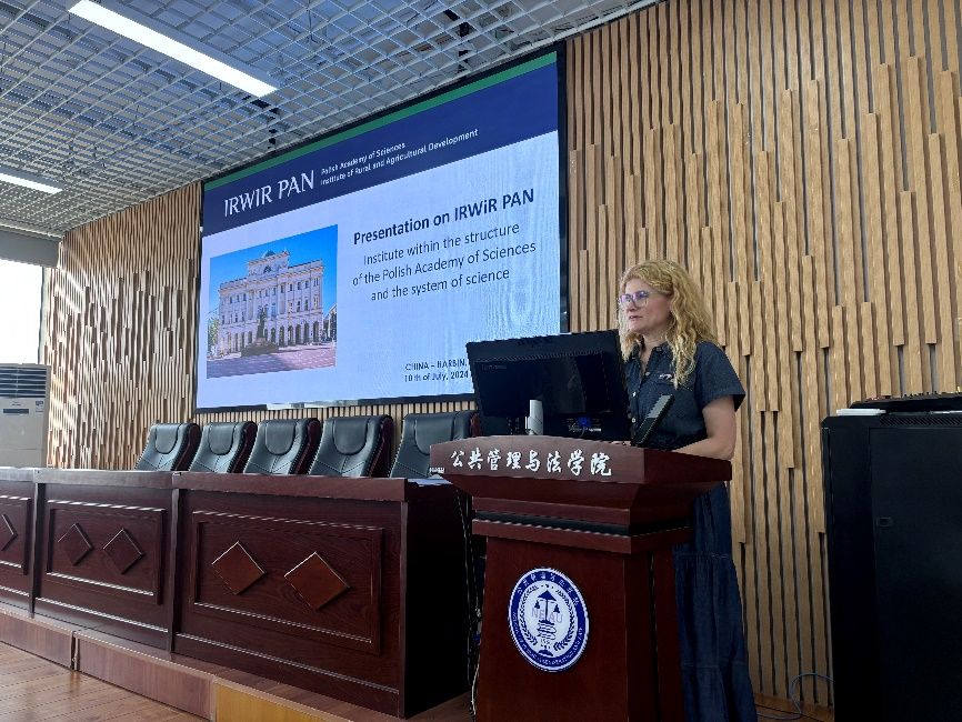 在会议报告环节,波兰科学院农村和农业发展研究所所长Monika Stanny作了《IRWiR PAN. Institute within the structure of the Polish Academy of Sciences and the system of science(波兰科学院科学系统内部结构)》的报告,从人员结构、部门组成以及具体工作内容的角度充分介绍了波兰科学院,让现场师生对波兰科学院有了进一步的认识和了解。