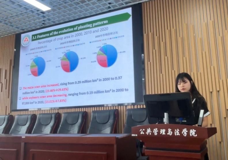 东北农业大学公共管理与法学院研究生马梦琪作了《Analysis of the Spatial and temporal evolution of Maize-soybean cropping patterns and its link with climate warming in Northeast China between 2000 and 2020(2000—2020年东北地区玉米大豆种植格局时空演变及其与气候变暖的联系)》的报告,分析了全球气候变化对农业生产的影响以及作物种植格局与生物气候因素变化之间的关系,为东北地区农业种植制度的优化提供了建议。