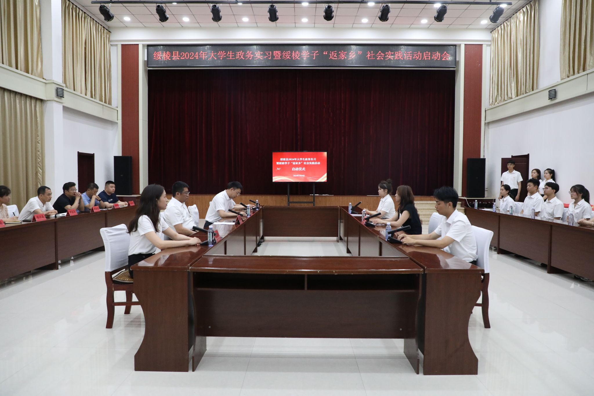7月24日,招生就业处与绥棱县委组织部在绥棱县政府二楼会议室召开了2024年大学生政务实习启动会。绥棱县委常委、组织部部长张纪韬,招生就业处市场科科长房丹丹,绥棱县相关乡镇、部门主要负责同志及28名政务实习学生出席仪式。会议由绥棱县委组织部副部长李沐主持。