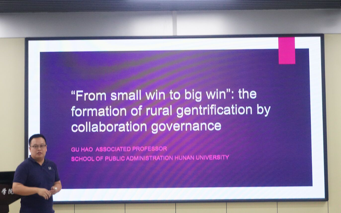 湖南大学公共管理学院副教授谷浩作了《From small win to big win: the formation of rural gentrification by collaborative governance(从小赢到大赢:协同治理下农村士绅化的形成)》的报告。报告从资本流动、生活方式变化和协作治理三方面助力农村实现士绅化转型,并提出通过协作治理实现从“小赢”到“大赢”的农村发展新路径。