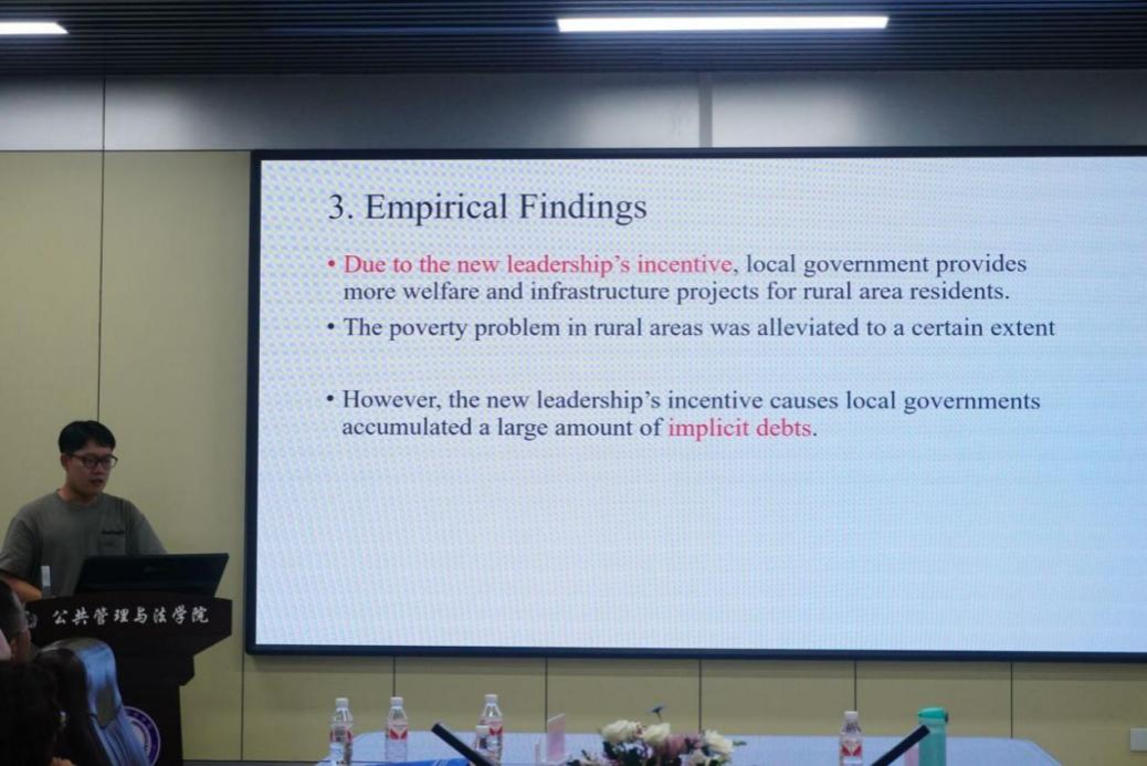 东北农业大学公共管理与法学院研究生卢汇川作了《Unbalanced Development and Government Expenditure Policy Reform: Evidence from China(非均衡发展与政府支出政策改革:来自中国的证据)》的报告。报告从经济放缓、城乡差距及政府支出政策改革三个方面,剖析了中国地方政府隐性债务的形成机制,提出了加强财政监管、提高投资质量的政策建议。