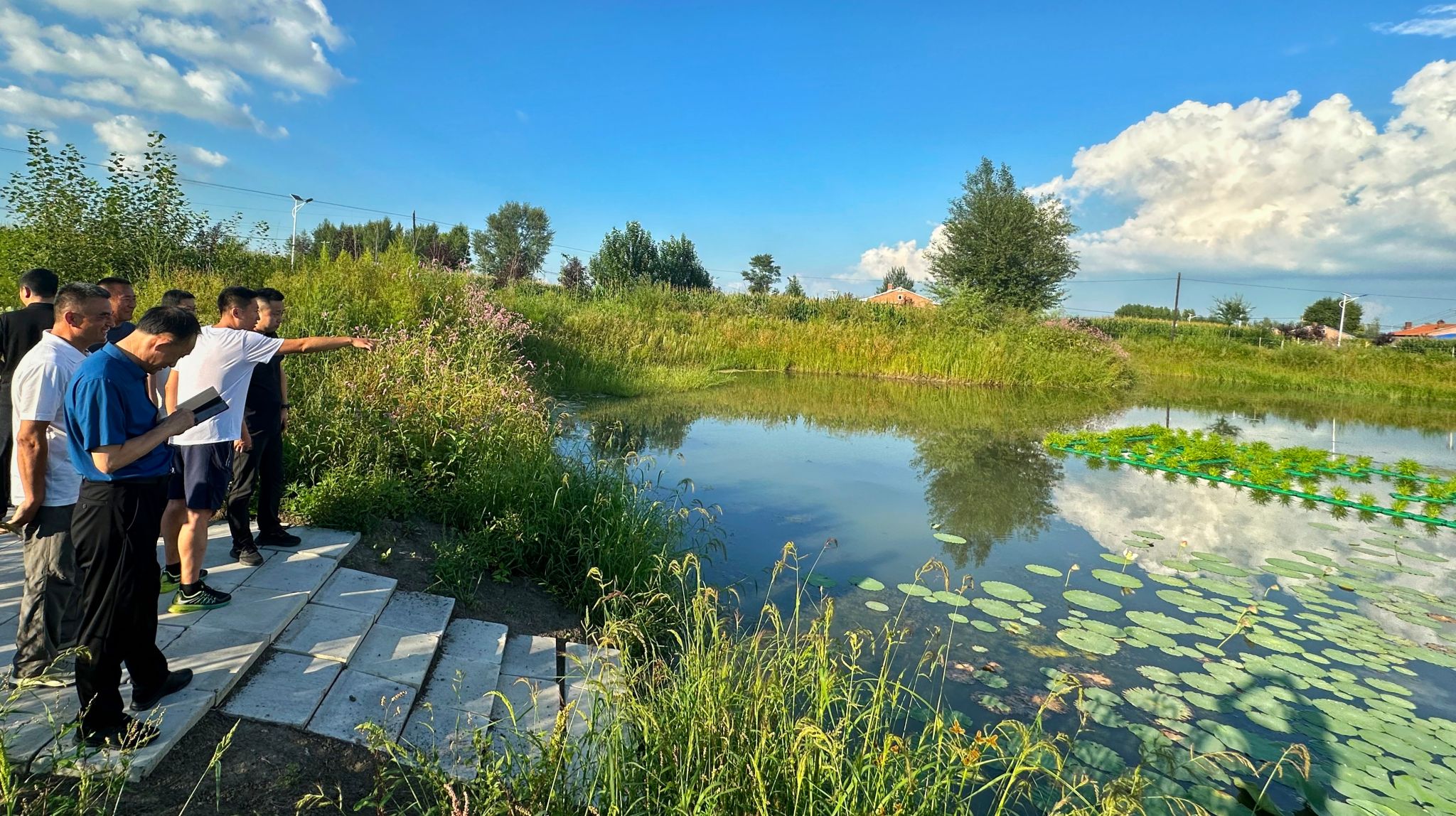 张明宇对东北农业大学驻村工作队的生活和工作情况进行了深入了解,仔细询问了驻村工作队在东发村的具体工作进展和遇到的困难。张明宇一行对东发村的水稻示范区和鱼菜共生技术示范区进行调研,详细了解了东北农业大学作为技术支撑的现代农业项目的实施情况和技术应用成效。