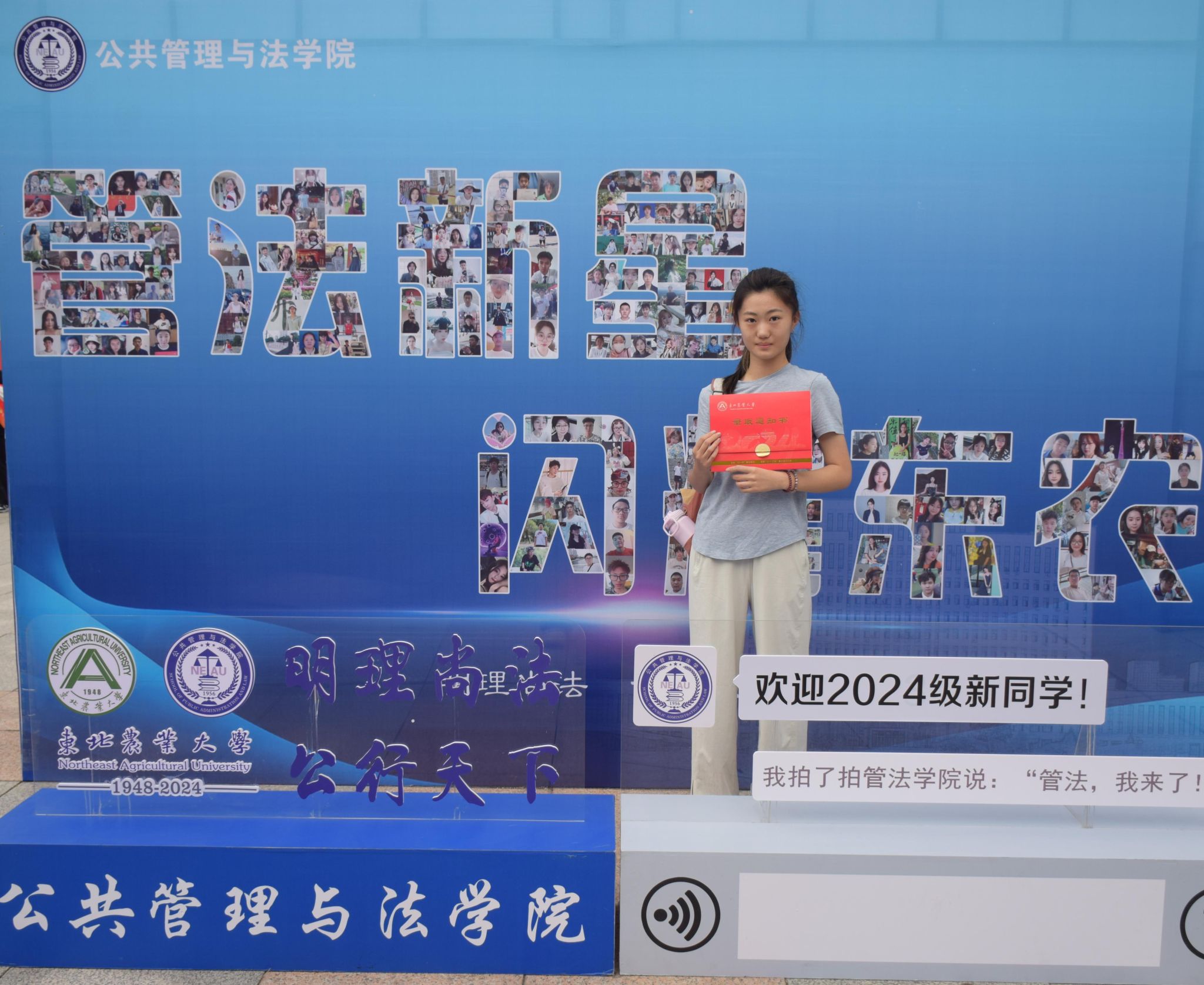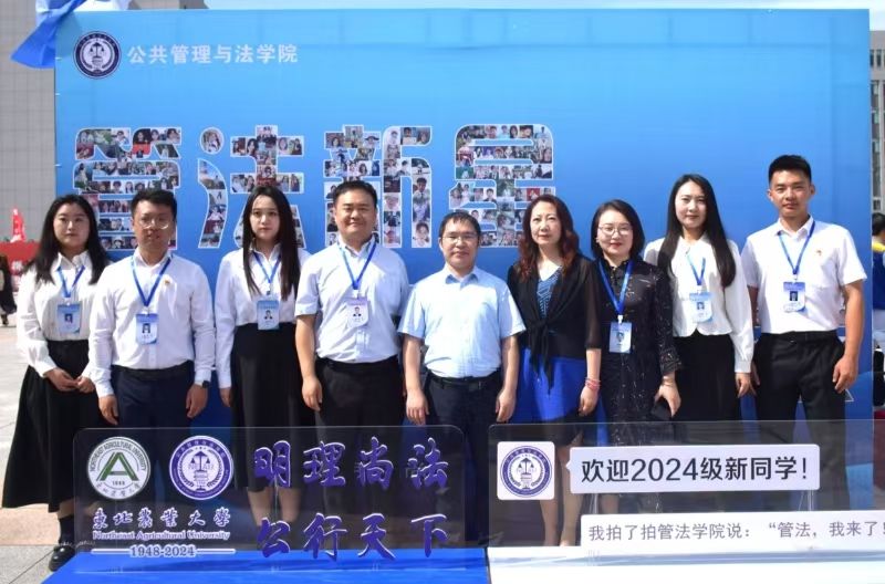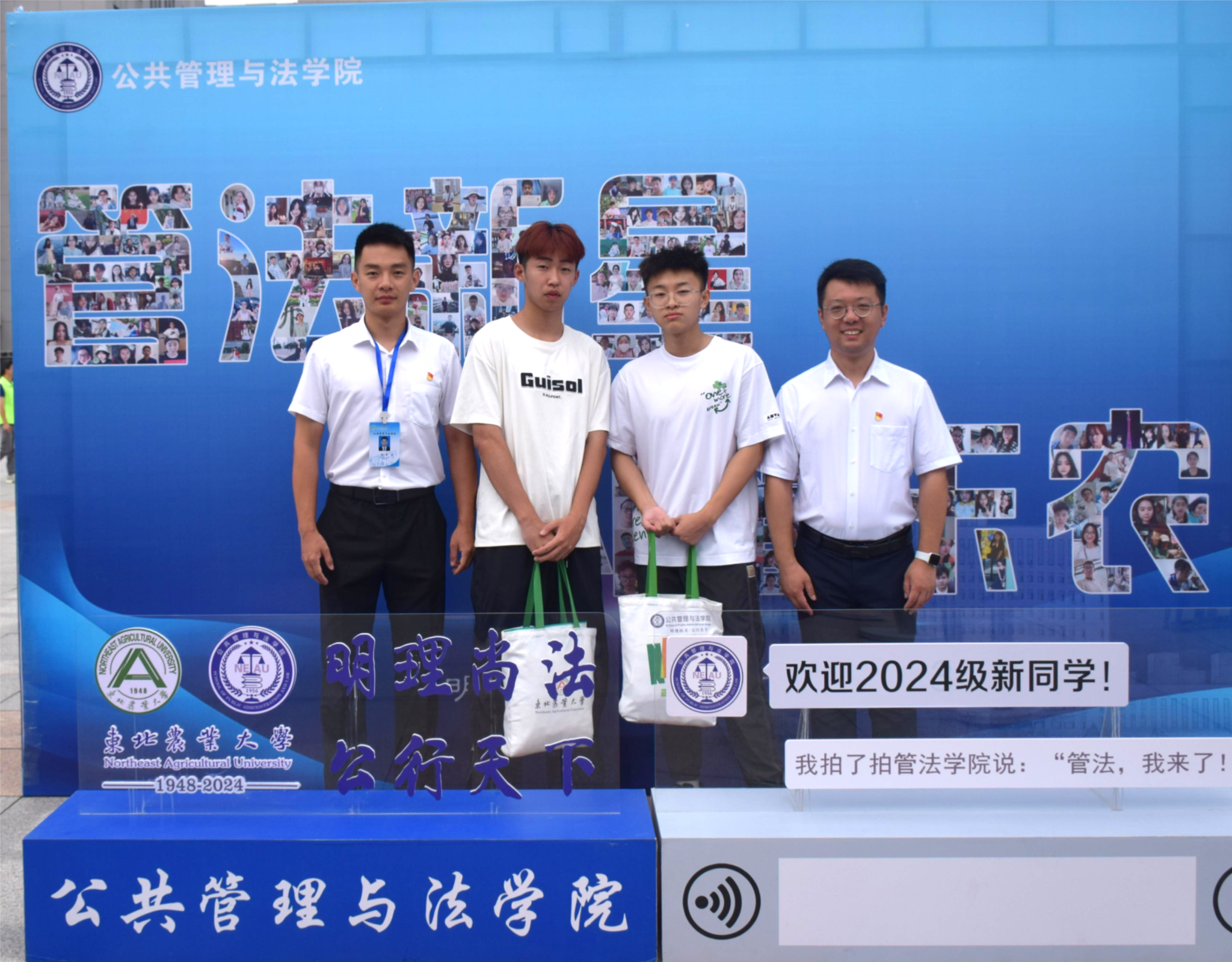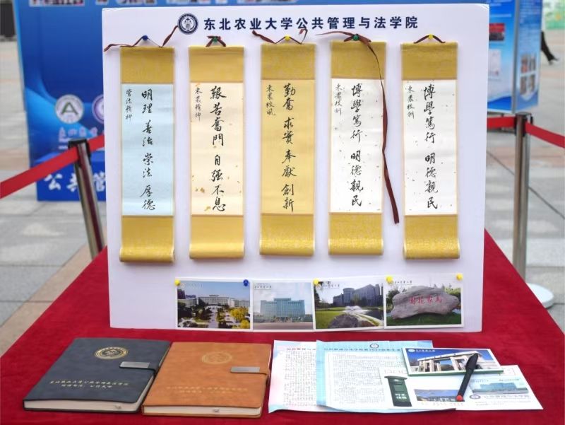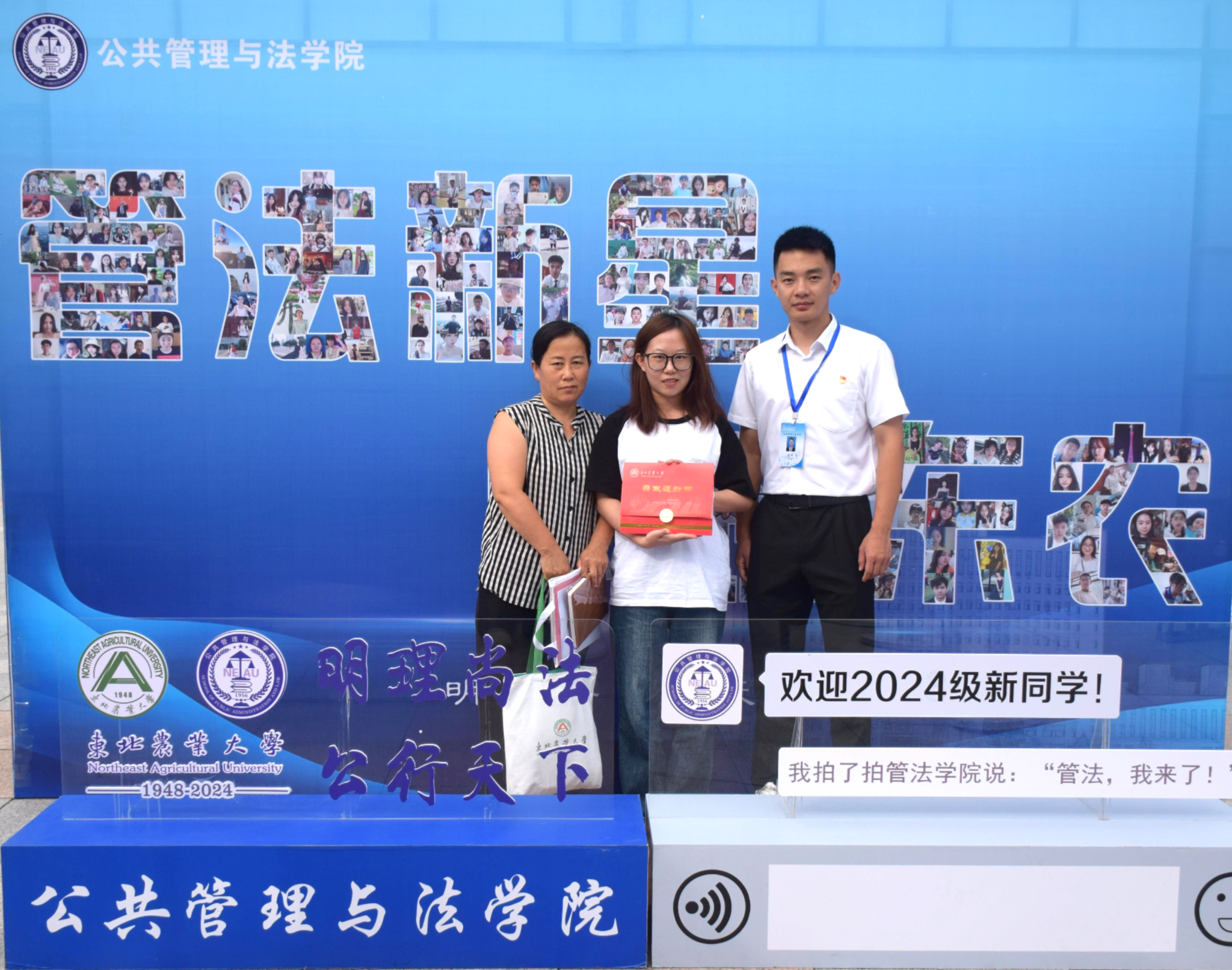 迎新现场,管法学院创意定制“东农校训”“东农精神”“东农校风”、“管法精神”“管法院训”卷轴与精美迎新礼包,突出学校和学院人文关怀,激发新生强农兴农、知农爱农的情怀担当。精心设计由全体新生笑脸照片集结而成的“管法新星”背景墙,全方位营造浓厚迎新氛围。学院充分利用空间布局,在迎新场地为新生展示了学院升学与就业光荣榜、法袍、无人机、全站仪等设备,供新生提前了解自己所学专业,并摆放LED电子屏幕、循环播放学院简介、师资力量与发展成就,鼓励新生以拼搏之心不断前行,以青春之我谱写管法新篇章。