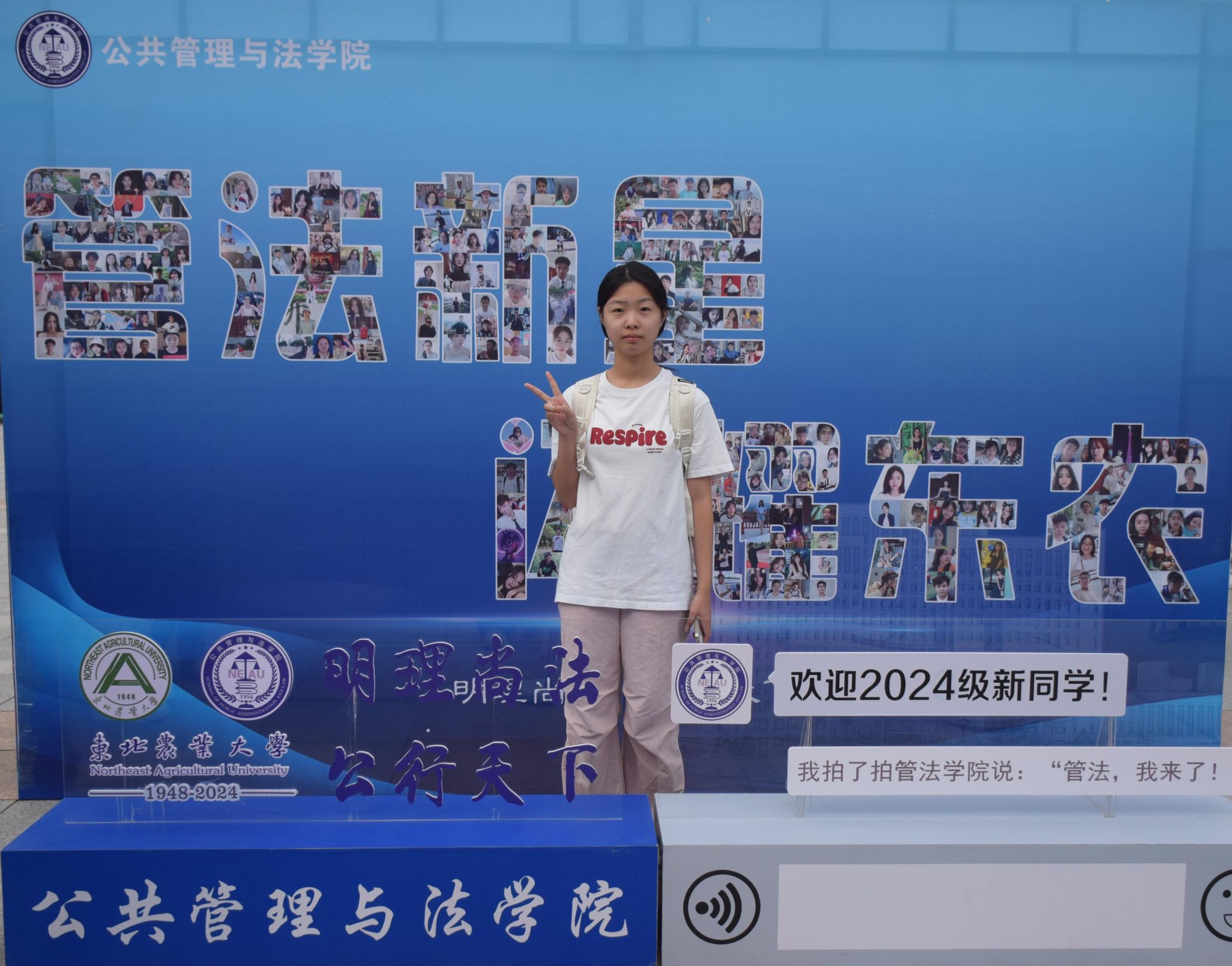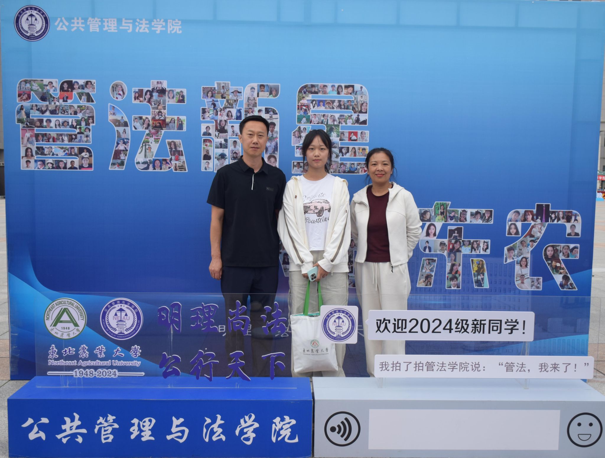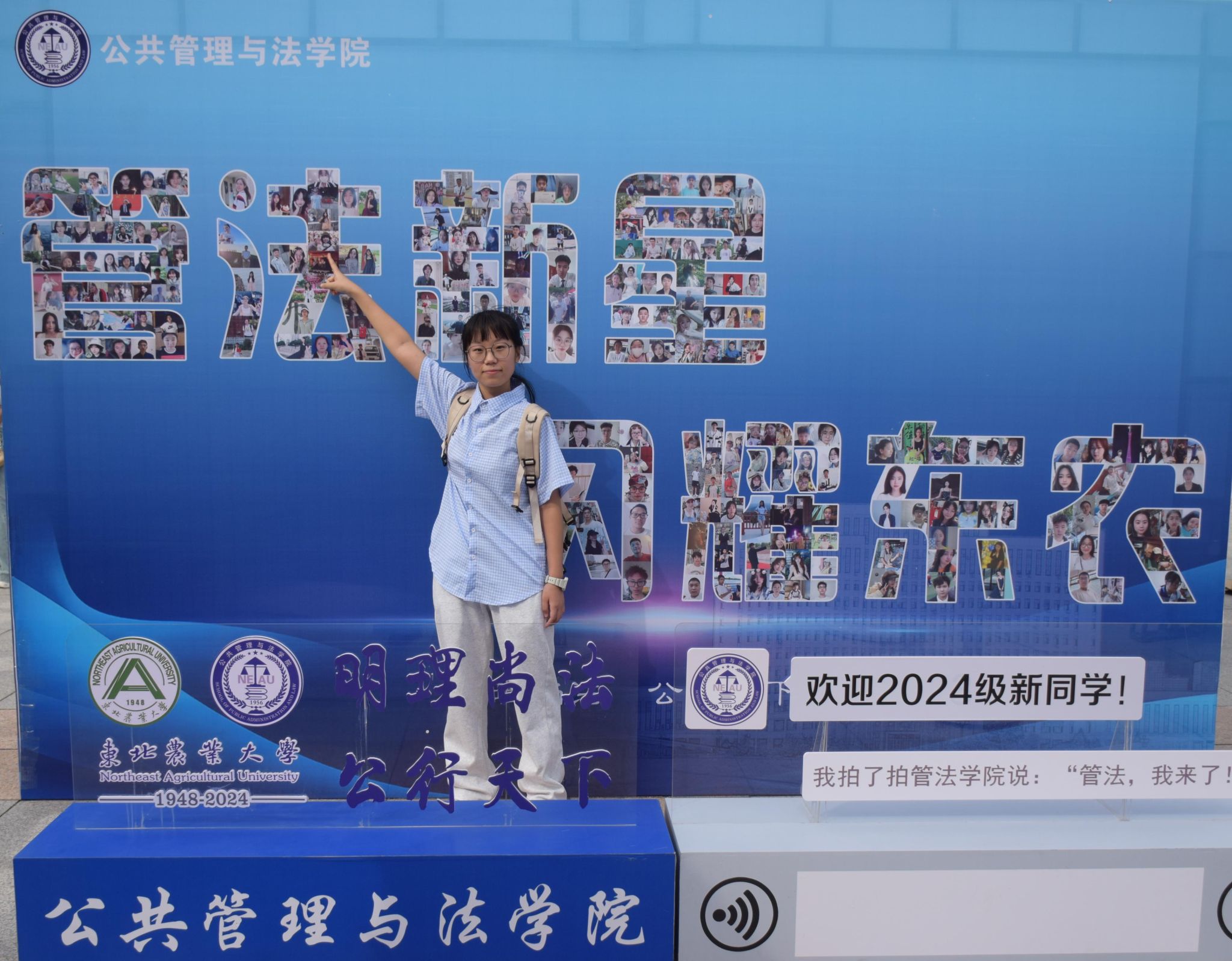 迎新现场,管法学院创意定制“东农校训”“东农精神”“东农校风”、“管法精神”“管法院训”卷轴与精美迎新礼包,突出学校和学院人文关怀,激发新生强农兴农、知农爱农的情怀担当。精心设计由全体新生笑脸照片集结而成的“管法新星”背景墙,全方位营造浓厚迎新氛围。学院充分利用空间布局,在迎新场地为新生展示了学院升学与就业光荣榜、法袍、无人机、全站仪等设备,供新生提前了解自己所学专业,并摆放LED电子屏幕、循环播放学院简介、师资力量与发展成就,鼓励新生以拼搏之心不断前行,以青春之我谱写管法新篇章。