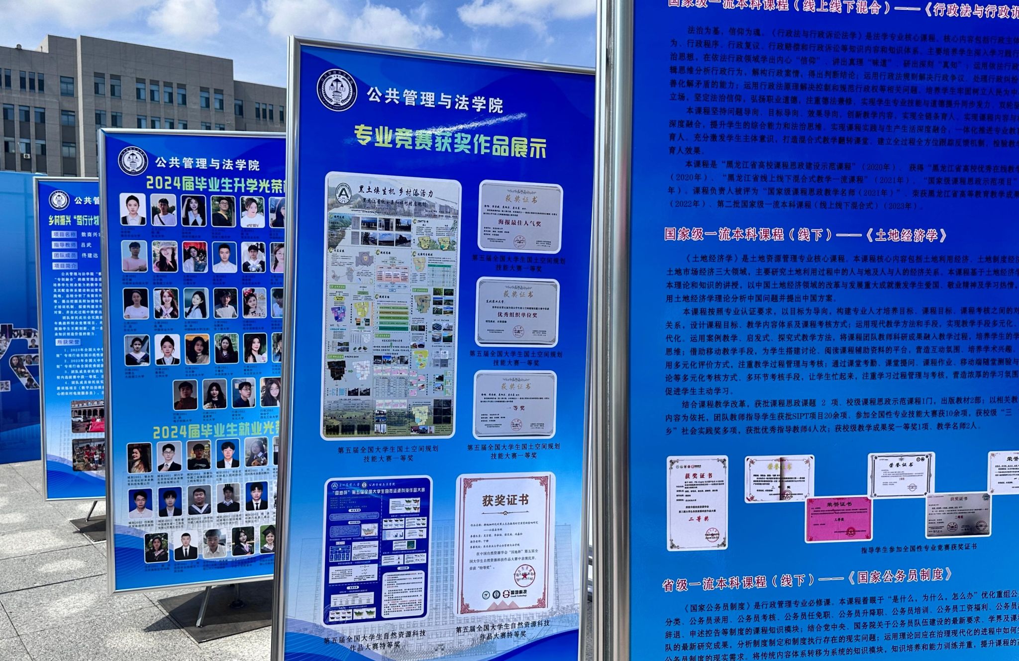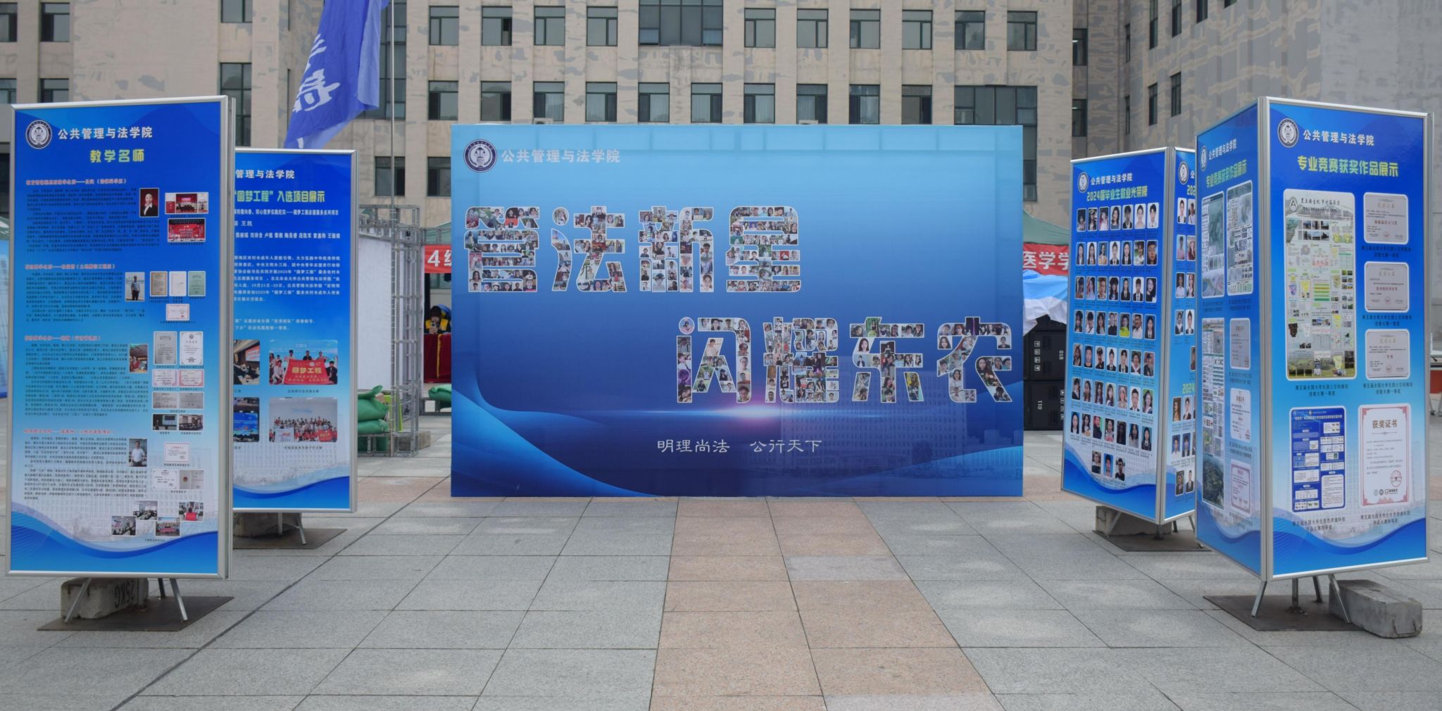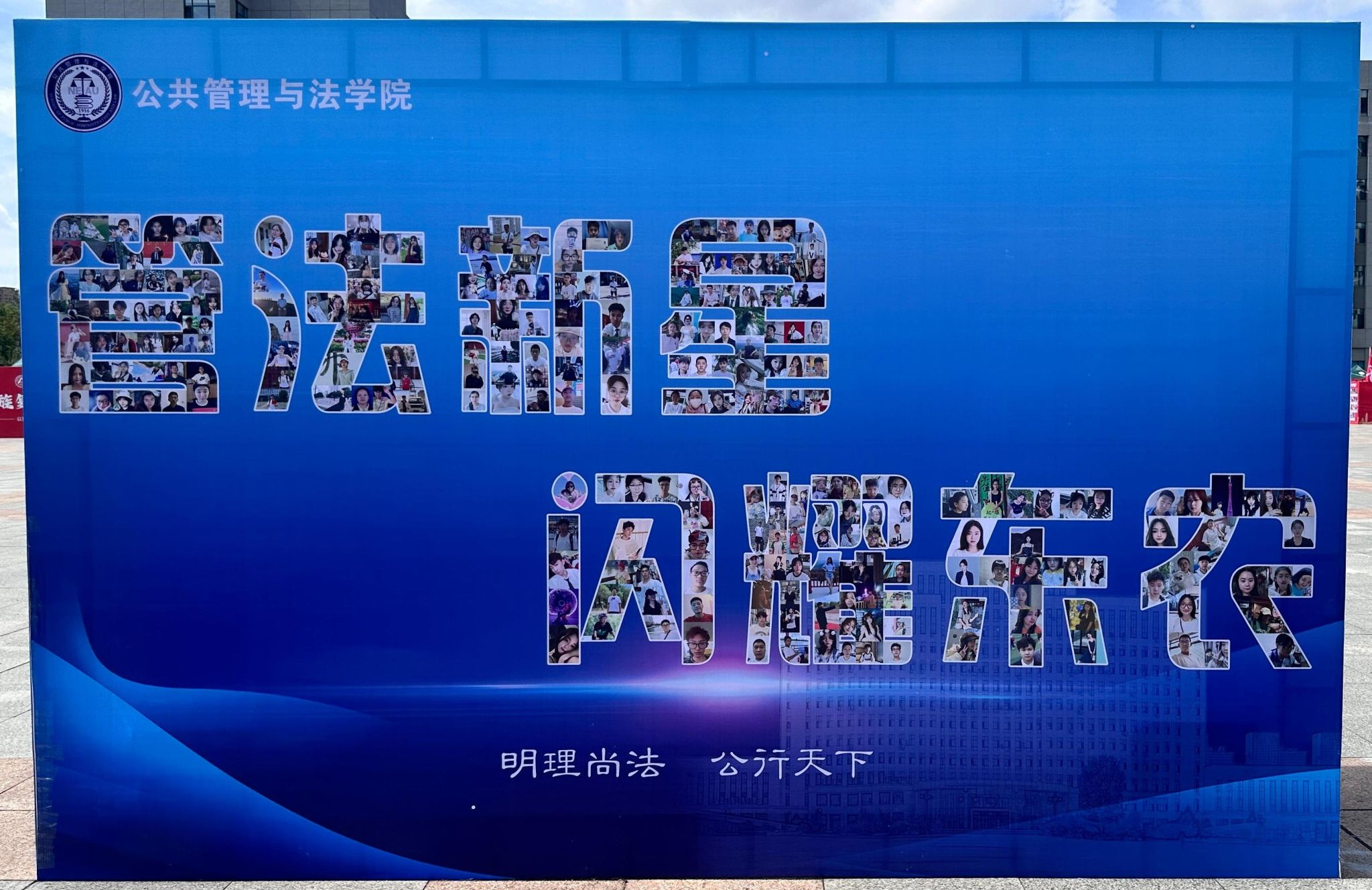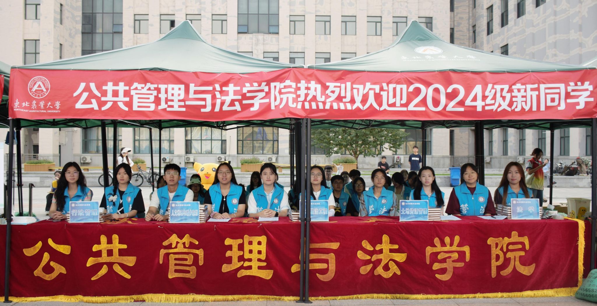 迎新现场,管法学院创意定制“东农校训”“东农精神”“东农校风”、“管法精神”“管法院训”卷轴与精美迎新礼包,突出学校和学院人文关怀,激发新生强农兴农、知农爱农的情怀担当。精心设计由全体新生笑脸照片集结而成的“管法新星”背景墙,全方位营造浓厚迎新氛围。学院充分利用空间布局,在迎新场地为新生展示了学院升学与就业光荣榜、法袍、无人机、全站仪等设备,供新生提前了解自己所学专业,并摆放LED电子屏幕、循环播放学院简介、师资力量与发展成就,鼓励新生以拼搏之心不断前行,以青春之我谱写管法新篇章。