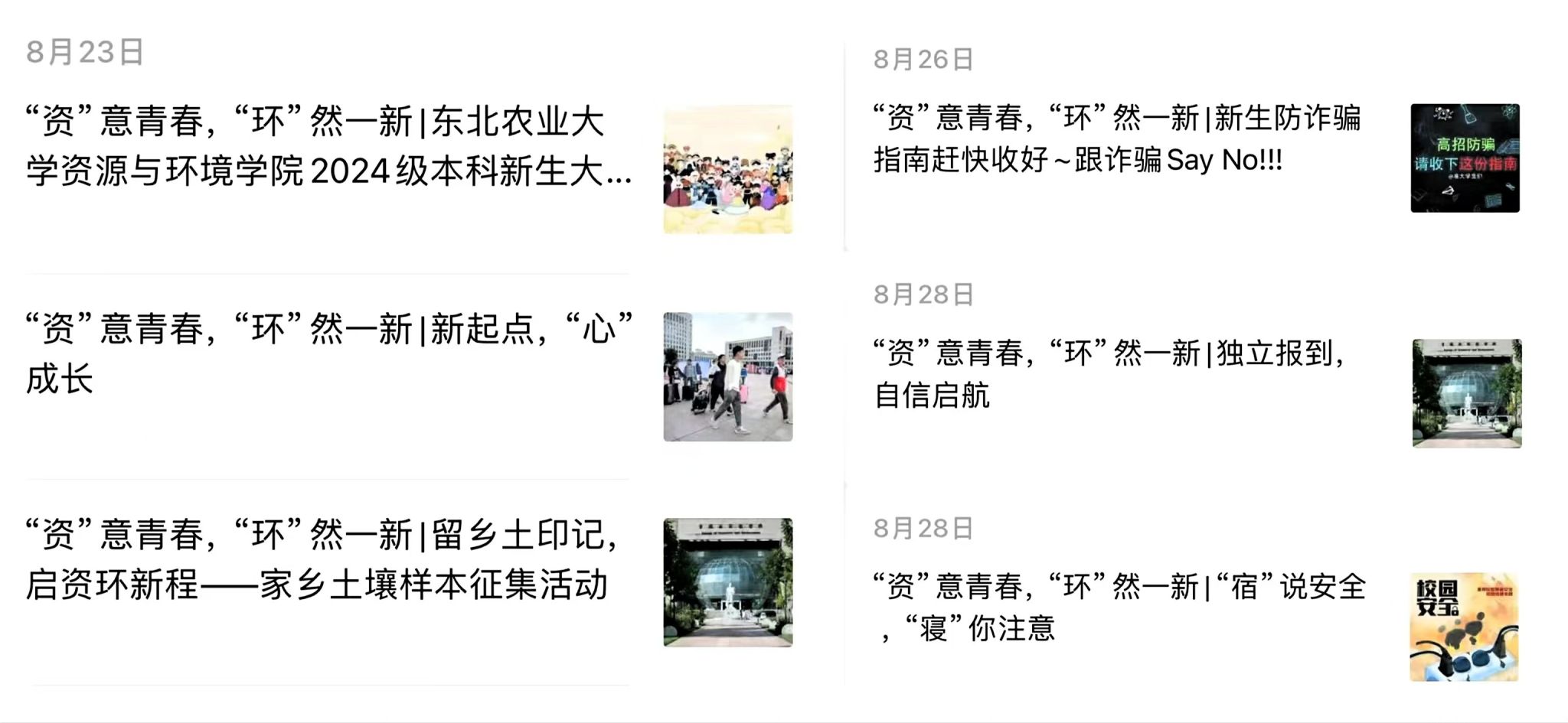校领导来到迎新现场,对学院处处体现专业元素的设计给予肯定和认可。土壤标本、气象观测仪、实验试剂、蘑菇菌类等代表专业特色的展品悉数亮相“专业第一课”,让新生对专业有了感性的认知。“资环学工”公众号开设迎新专栏,发布“‘资’意青春,‘环’然一新”系列图文6篇,持续推送院史院情、专业认知教育系列专题,让新生了解具有地域特色的黑土文化,上好第一堂“专业课”。