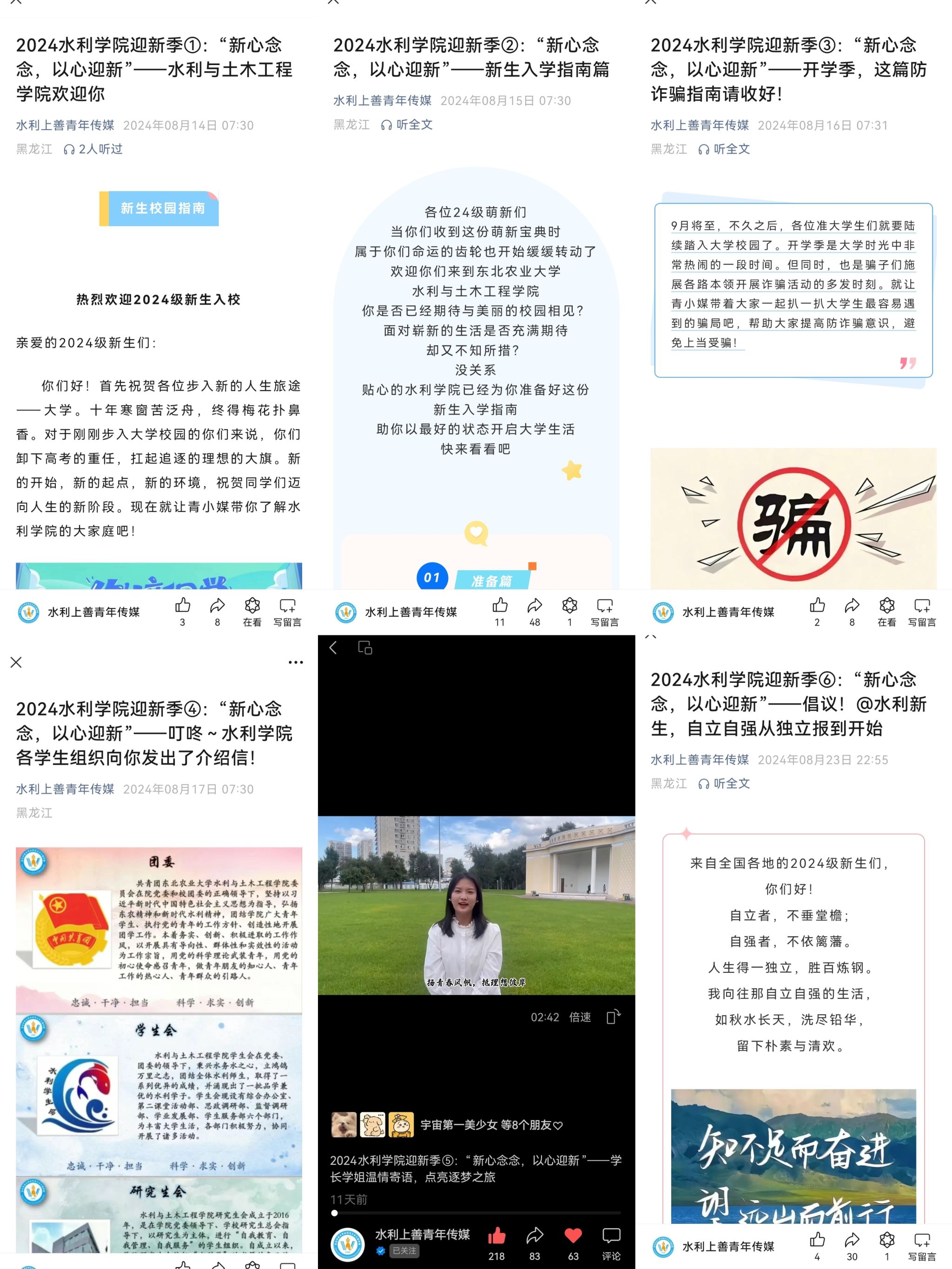 按照学校迎新工作及新生入学教育的总体安排,响应“独立报到、把握主动”的学涯适应要求,帮助新生直面未知与挑战、快速融入大学生活,学院以“自立”为主线、以“自强”为宗旨,将“育人育心”贯穿迎新工作始终。抢抓新生入学“前置教育”有利契机,推动大学与高中教育贯通衔接,依托水利上善青年传媒官方微信平台开设“2024水利学院迎新季”专栏,适时发布校史院情、价值引领、安全教育、入学指南、校园生活等系列推送,推送“写给2024级新生的一封信”,打造全方位、前置化、体验式新生入学教育,引导新生尽快转换自身角色、适应大学生活。同时,学院利用今日校园、迎新工作群等,全面摸排掌握新生情况,了解新生入学的困惑和需求,靶向输送学校政策和专业发展情况,以“精准定制”赢得新生及家长“独立安心”。新生辅导员召开新生报到前线上见面会,详细解读报到流程、重点强调入学提示,帮助新生提前掌握报到的具体要求和暖心贴士,向新生及家长发出“自立自强从独立报到开始”的呼吁号召,为成就学生自理、自立、自强的精彩人生打牢坚实基础。