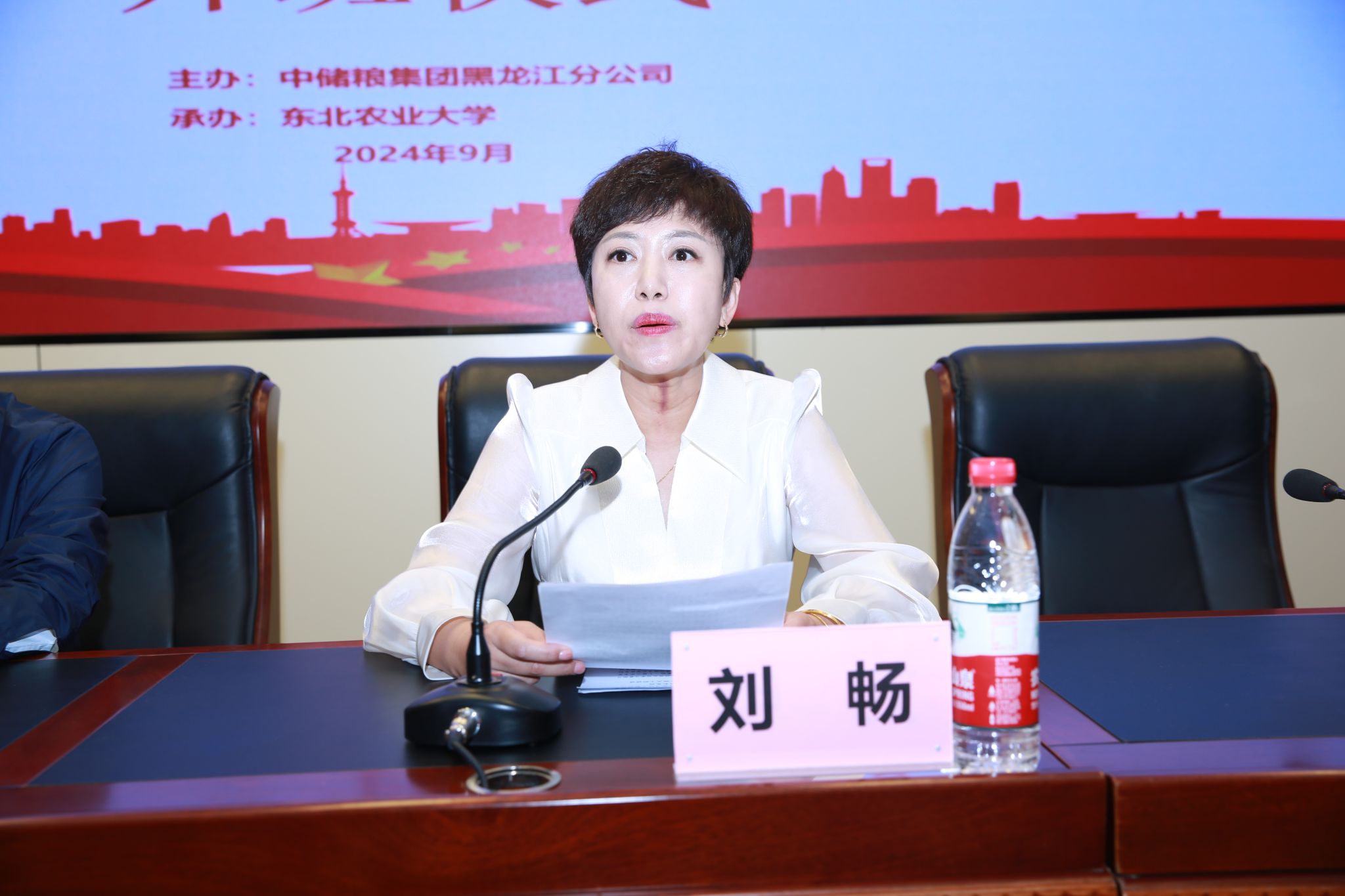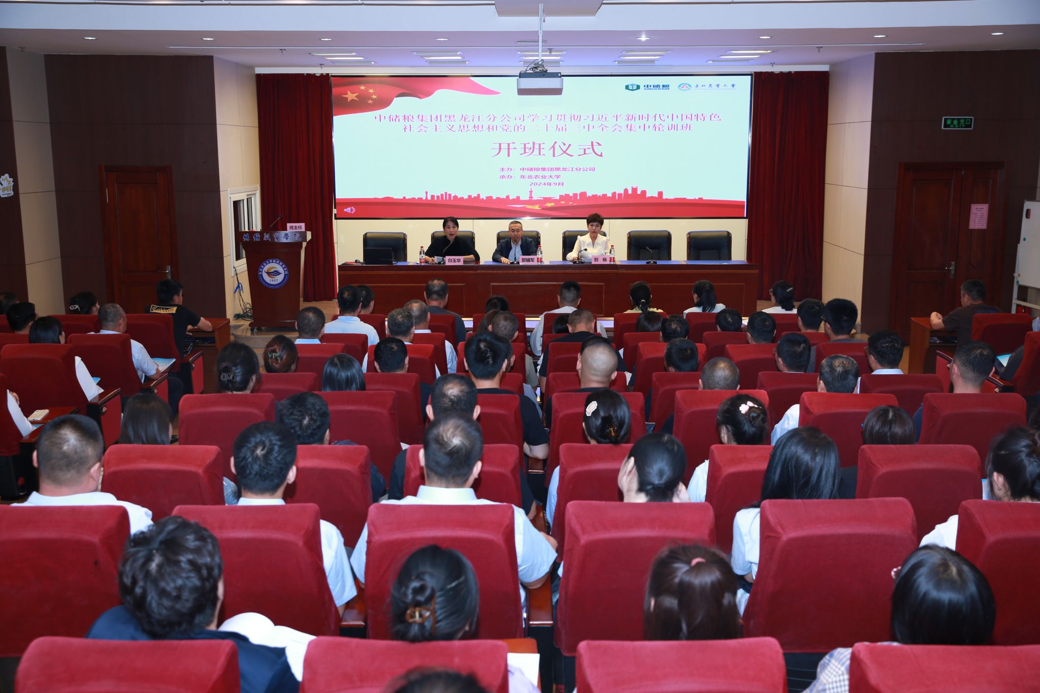 9月10日下午,由中储粮集团黑龙江分公司主办,东北农业大学承办的学习贯彻习近平新时代中国特色社会主义思想和党的二十届三中全会精神集中轮训班在继续教育学院举办开班仪式,中储粮集团黑龙江分公司党群人事处处长郭辅军、东北农业大学继续教育学院院长刘畅以及来自全省各地市中储粮直属库共计180名科级干部参加会议。开班式由继续教育学院副院长白玉华主持。