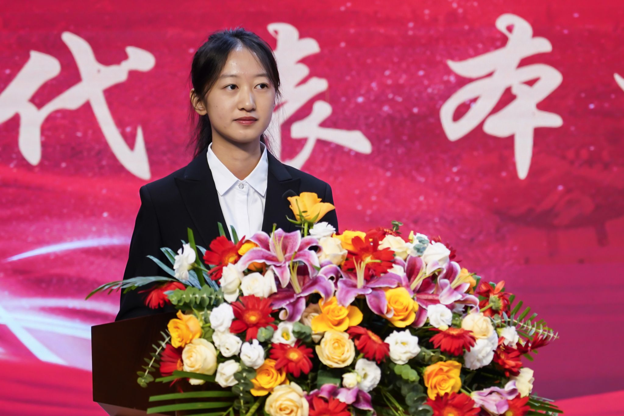博动医2401班李博同学代表研究生新生发言。他回顾了自己与东农八年来的青春故事,分享了自己在奋斗道路上的成长与历练,呼吁同学们在追求卓越的道路上奋斗不息,勇担国家使命,共创东农荣誉。