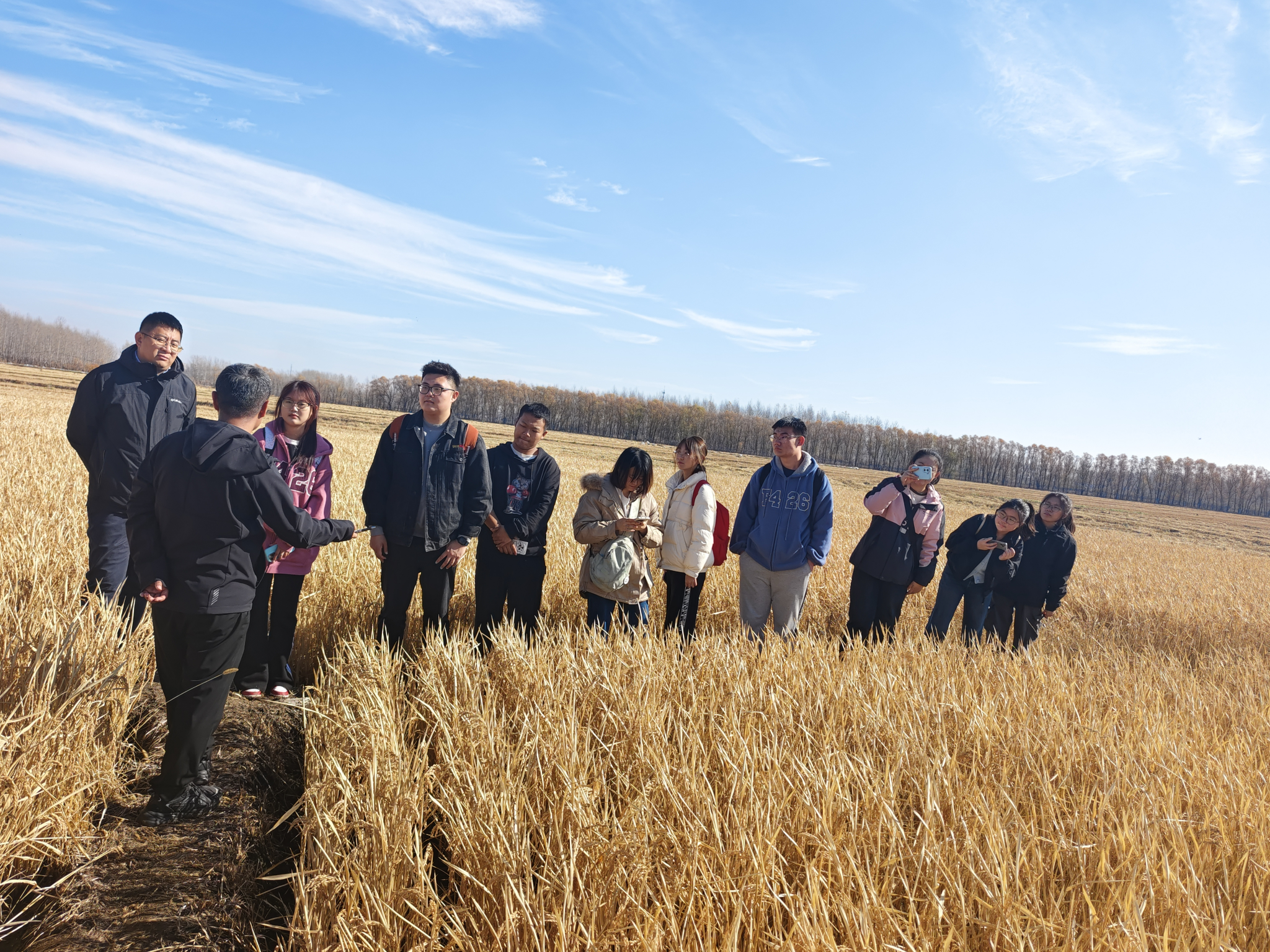 随后,师生代表在农业局副局长李磊带领下参观农业示范园区,在稻田边向学生介绍绥棱镇地理气候特征、基本农田面积、各类农作物种植面积及产量等农业情况,详细讲解了水稻育苗技术无人机播种技术的实际应用情况,并鼓励学生们积极参与农业实践。学院新生万博涵说“这是我第一次来到农田里,看见了秋收中的水稻收割的大型农业机械,感觉很有意义,也让我对未来四年的专业学习更感兴趣了。”通过本次活动,学院将农业示范区作为“耕读教育”实践基地,进一步丰富了实践育人形式。