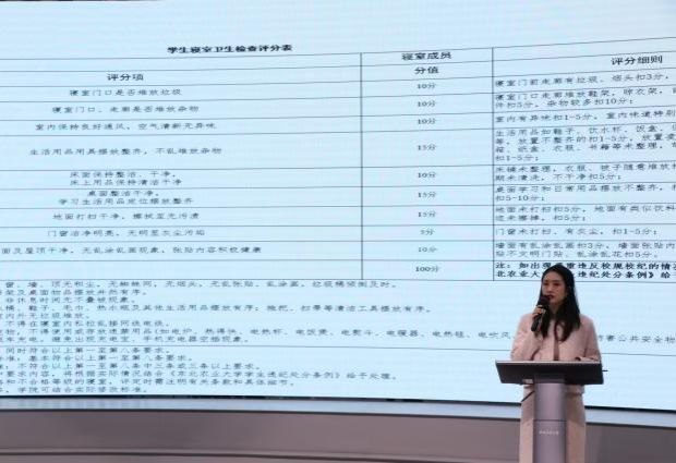 陈曦以宿舍安全的重要性为主题进行宣讲,强调宿舍安全以及卫生对于大学生活的重要性,鼓励同学们积极承担责任。同时以寝室评分标准为依据,督促同学们对标评分标准进行文明寝室建设,鼓励同学们用实际行动为宿舍安全管理贡献力量,成为专业基础扎实、课下生活规律的新时代青年。