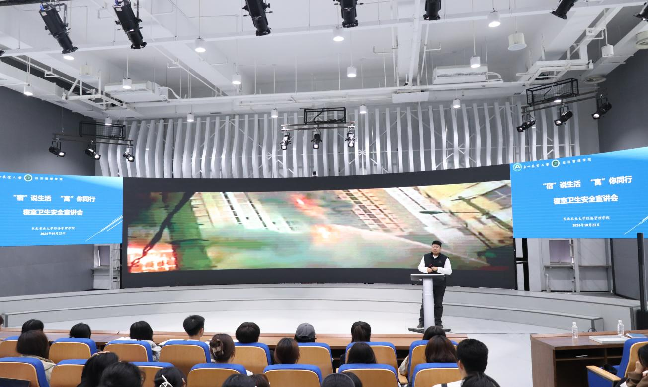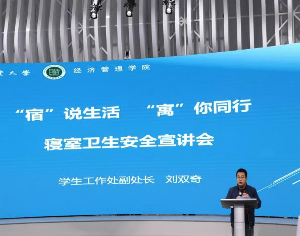 为进一步推进文明寝室建设,实现以评促建、以评促改、以评促管、评建结合,充分发挥学生寝室育人功能,加强学生主人翁意识,经济管理学院于10月23日下午在成栋楼13楼报告厅举办了“‘宿’说生活 ‘寓’你同行”寝室卫生安全宣讲会。学生工作部副部长刘双奇、经济管理学院党委副书记高天琦、团委书记陈曦、保卫处消防科刘浩东、辅导员肖扬、张浩哲及全院学生代表参加此次活动。