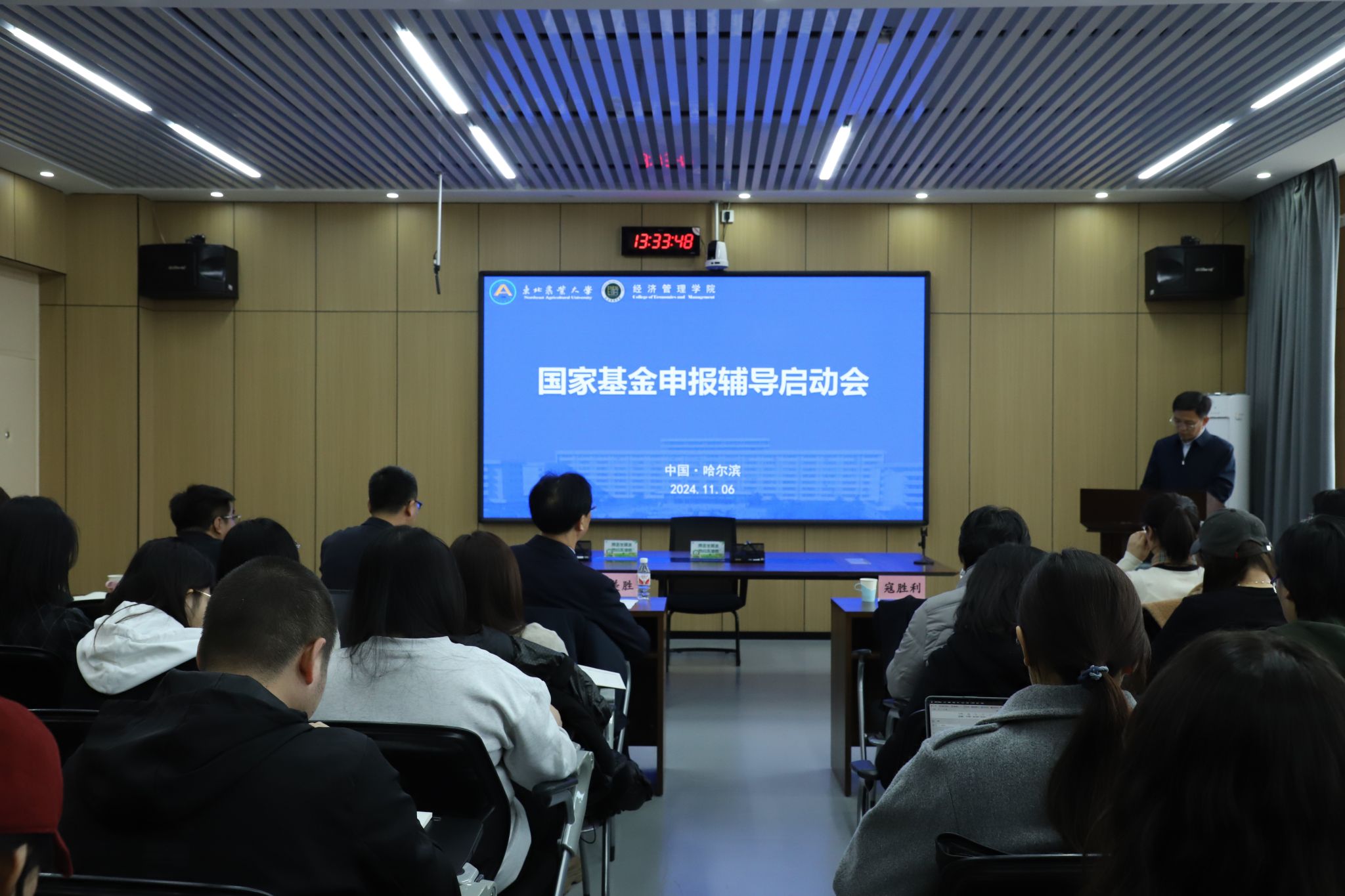 为进一步推动经济管理学院2025年度国家基金申报工作,提高项目申报质量及学院科研水平,11月6日下午,经济管理学院举办国家基金申报辅导启动会,出席本次会议的嘉宾有省委宣传部二级巡视员、黑龙江省哲学社会科学办公室原主任周美胜、东北农业大学科学技术处(社会科学处)处长寇胜利、经济管理学院院长余志刚、副院长王刚毅、王洋,人文社科管理科科长石晶、学院教师以及博士研究生。会议由王洋主持。