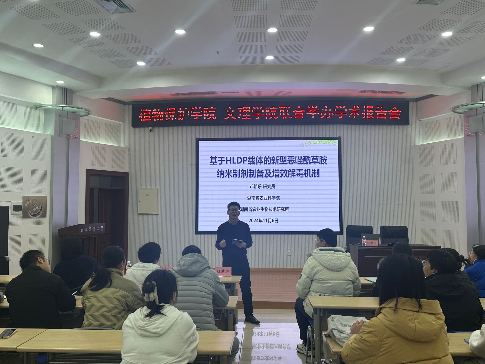 11月7日,植物保护学院、文理学院联合邀请湖南省农业科学院邓希乐研究员来校进行交流,并作题为“基于HLDP载体的新型恶唑酰草胺纳米制剂制备及增效解毒机制”的学术报告。植物保护学院国家高层次人才王相晶教授、文理学院院长付颖等60余位师生参加会议,会议由植物保护学院副院长程晓非主持。