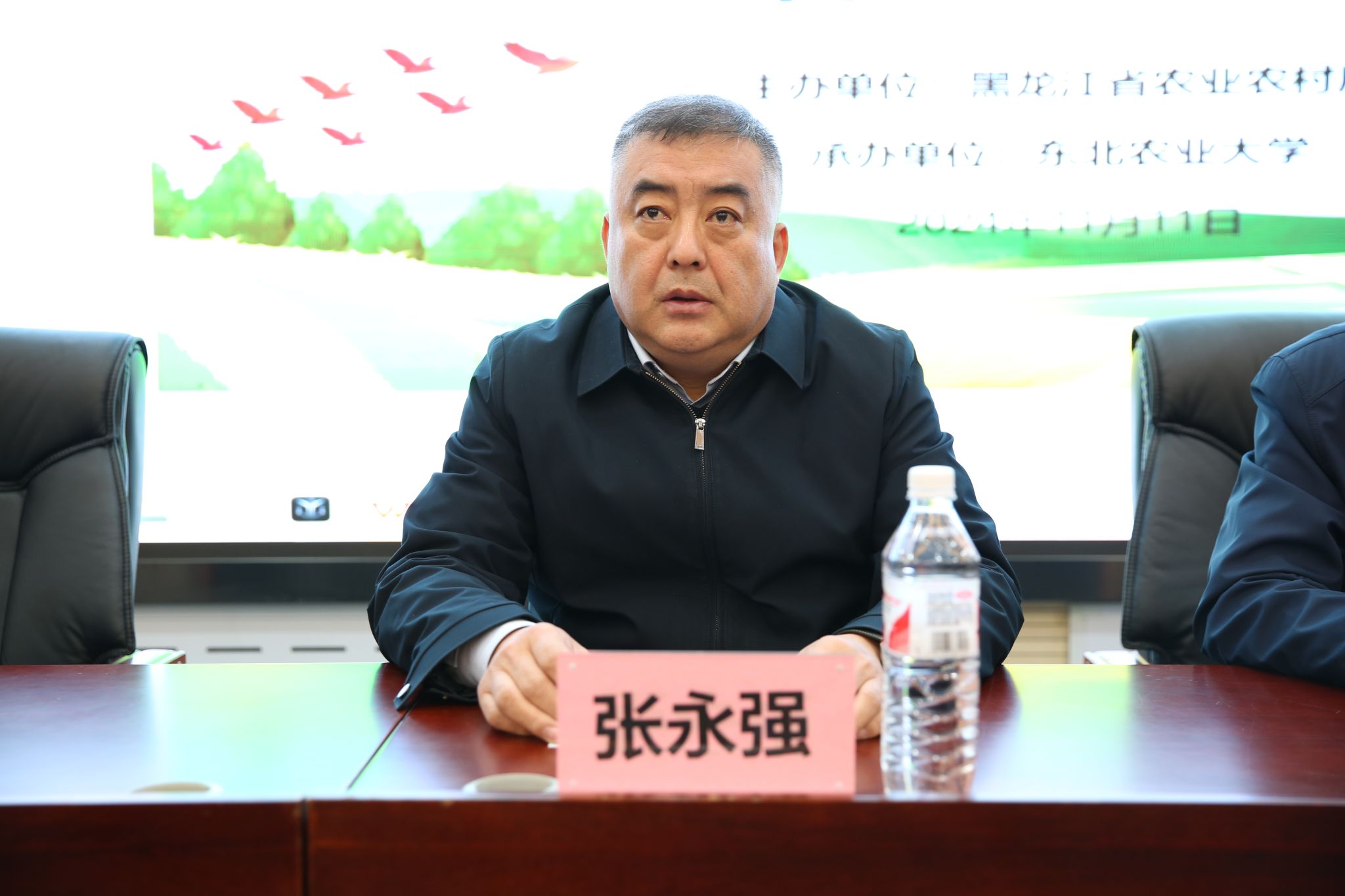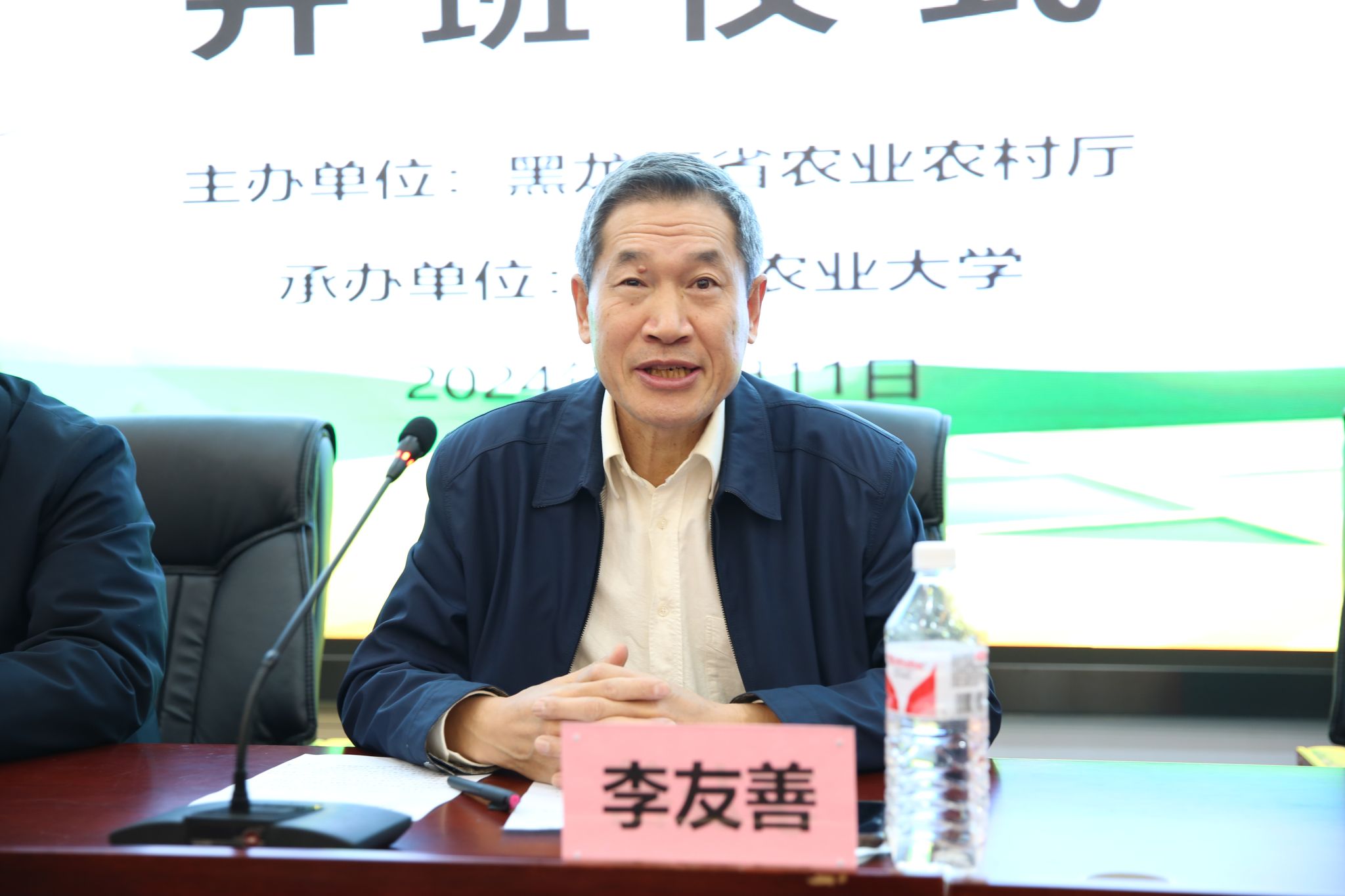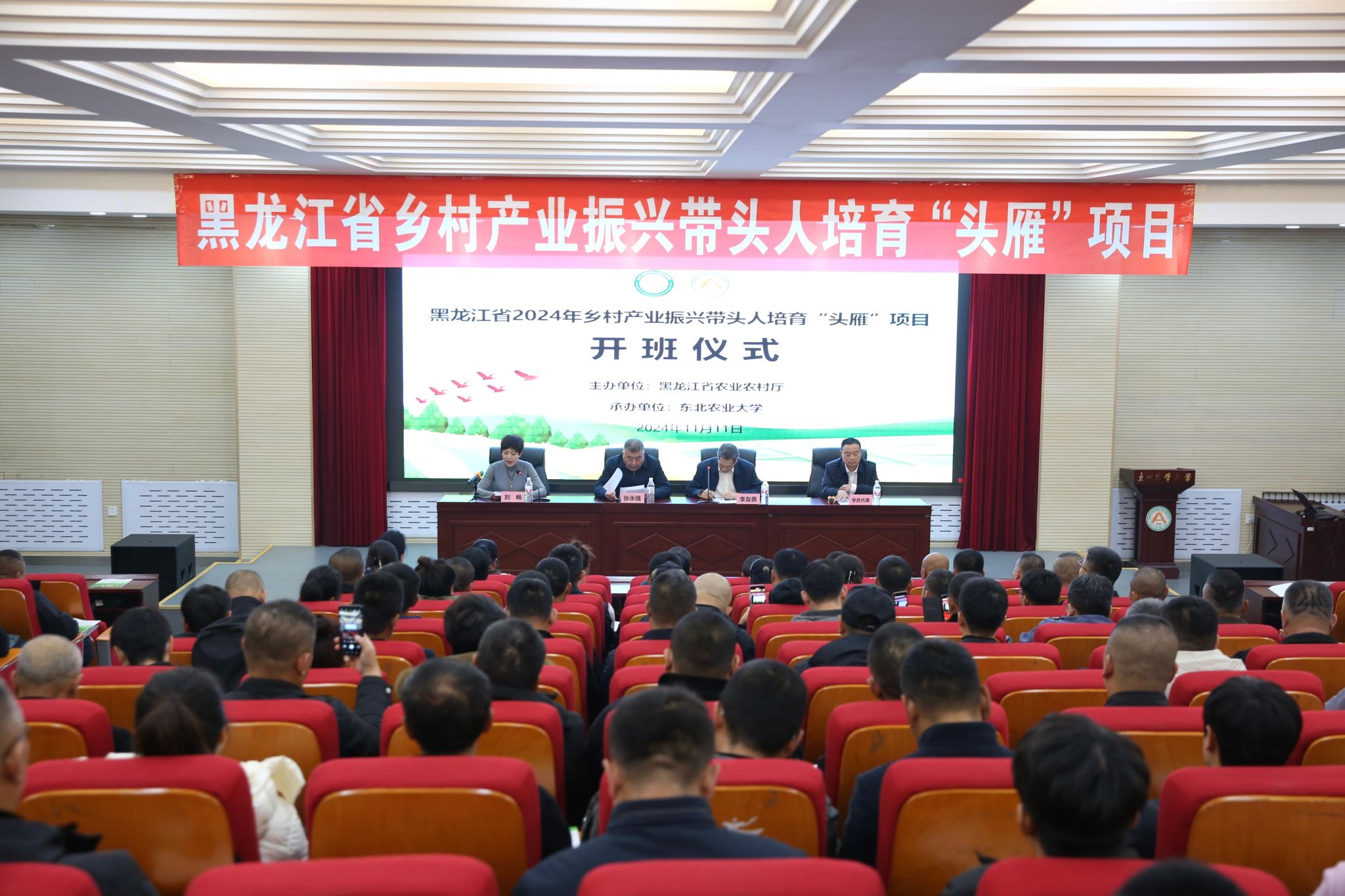 11月11日,由黑龙江省农业农村厅主办,东北农业大学承办的黑龙江省2024年乡村产业振兴带头人培育“头雁”项目开班仪式在东北农业大学国际文化教育学院会议室举行,来自哈尔滨市、牡丹江市、佳木斯市“头雁”学员共计216人参会。东北农业大学教务处处长张永强、继续教育学院党委书记李友善、院长刘畅、教务处非学历教育管理科科长李亨以及培训班班主任等工作人员参加会议。会议由李友善主持。