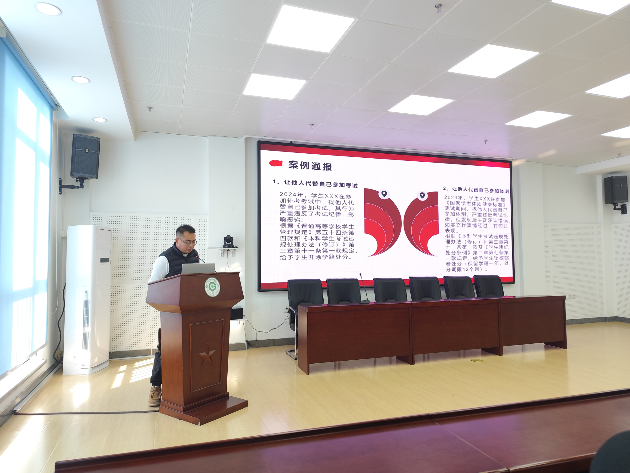 为迎接期末考试季,树立良好考风考纪,工程学院于11月19日至22日举办了7次诚信考试教育班会,旨在提升2024级新生的考风考纪意识。辅导员李明键和张旌围绕“本科学生考试违规处理办法学习”“学生考试违纪案例通报警示”和“诚信考试承诺书签订”三个主题,分批次对各班级进行教育。