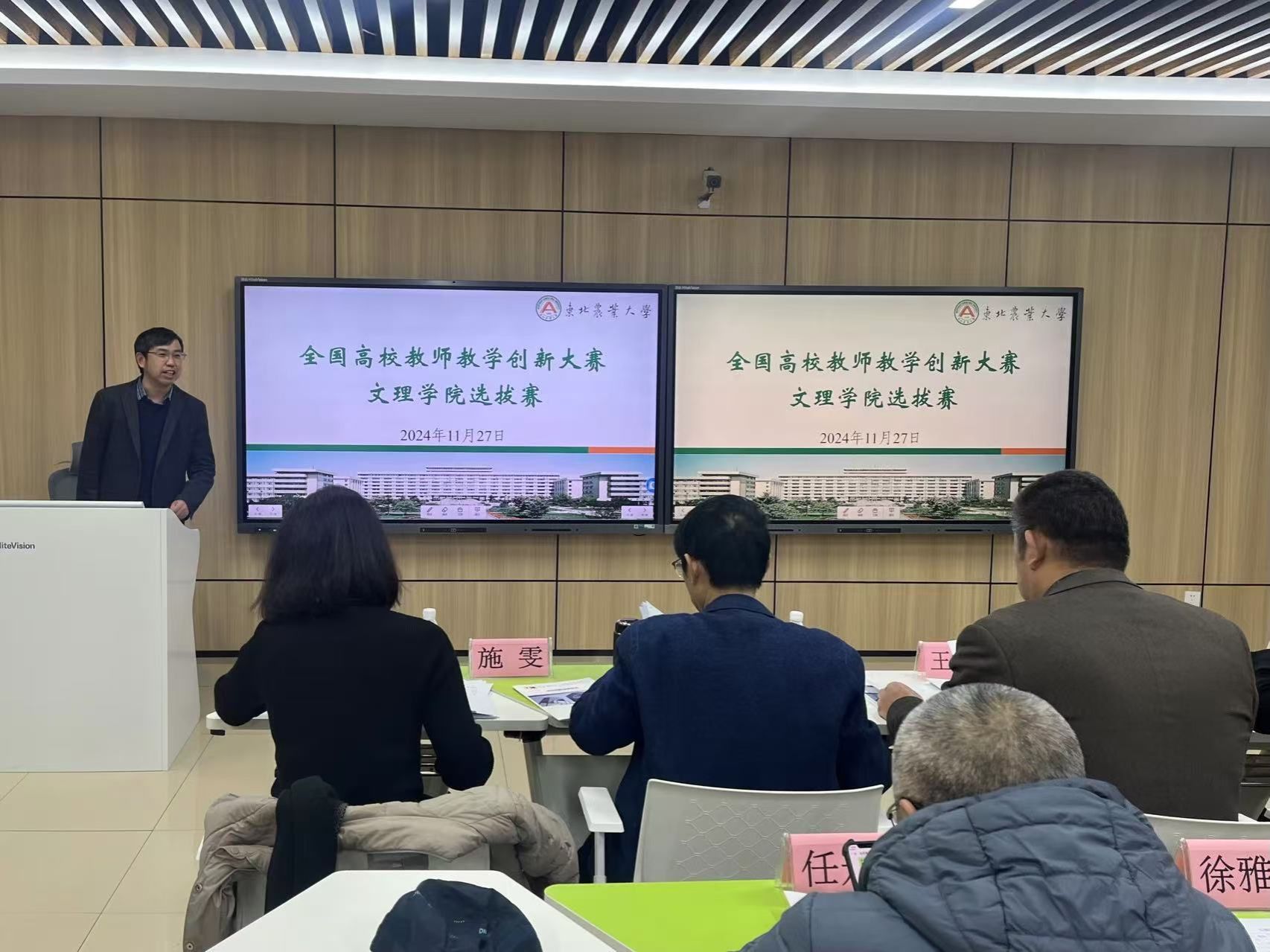 为进一步推进教育强国建设与高等教育高质量发展,落实立德树人根本任务,大力弘扬教育家精神,助力高校课程思政建设,推动信息技术与高等教育教学创新发展,提高产教协同育人成效,11月27日下午,文理学院举办高校教师教学创新大赛选拔赛。比赛邀请经济管理学院教授王杜春,文理学院教授叶非、付颖,动物科学技术学院副教授施雯,工程学院副教授郭丽峰,文理学院教学督导徐雅琴、任永泰、刘勇担任评委,各系部青年教师代表观摩比赛,文理学院副院长吴秋峰主持比赛。
