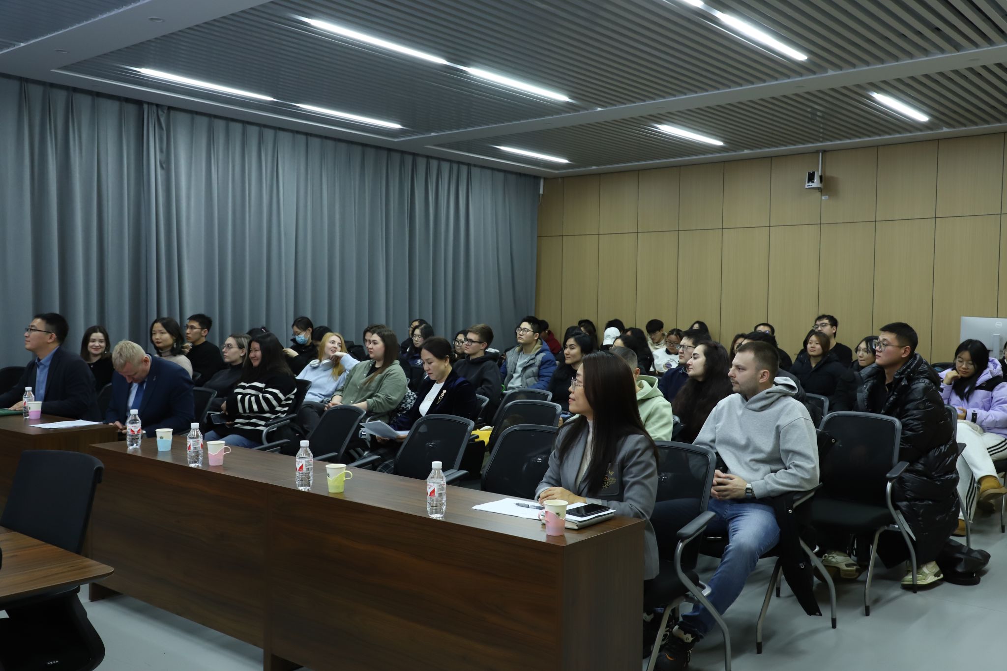 座谈会后,经济管理学院举办了专题学术报告会,俄罗斯太平洋国立大学经济管理学院副院长库里克介绍了学院的教育合作情况。高等教育管理学院院长西钮科夫为中俄学生作了题为《俄中经济合作主要方向》的学术报告,他表示,在俄中建交75周年之际,两国经贸合作水平已上升到新的高度,在对两国贸易规模、进出口产品结构和面临问题进行分析的基础上,指出了中俄两国未来经济合作的主要方向。