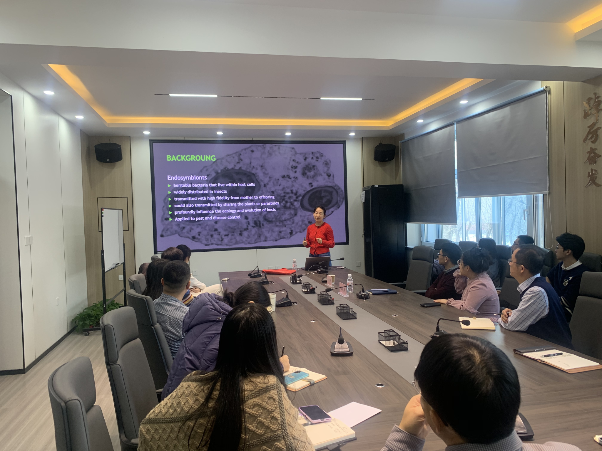 顾欣悦分享了关于利用共生菌防控蚜虫的最新研究进展和团队在实际研究中的经验和方法。随后,与参会师生深入探讨分析共生菌对蚜虫行为、繁殖、病毒传毒能力等方面的影响,并就报告中的重点内容进行了深入的学术讨论交流。本次报告会为学院相关师生提供了科研启发和指导,对推动研发新型害虫防治方法具有重要意义。