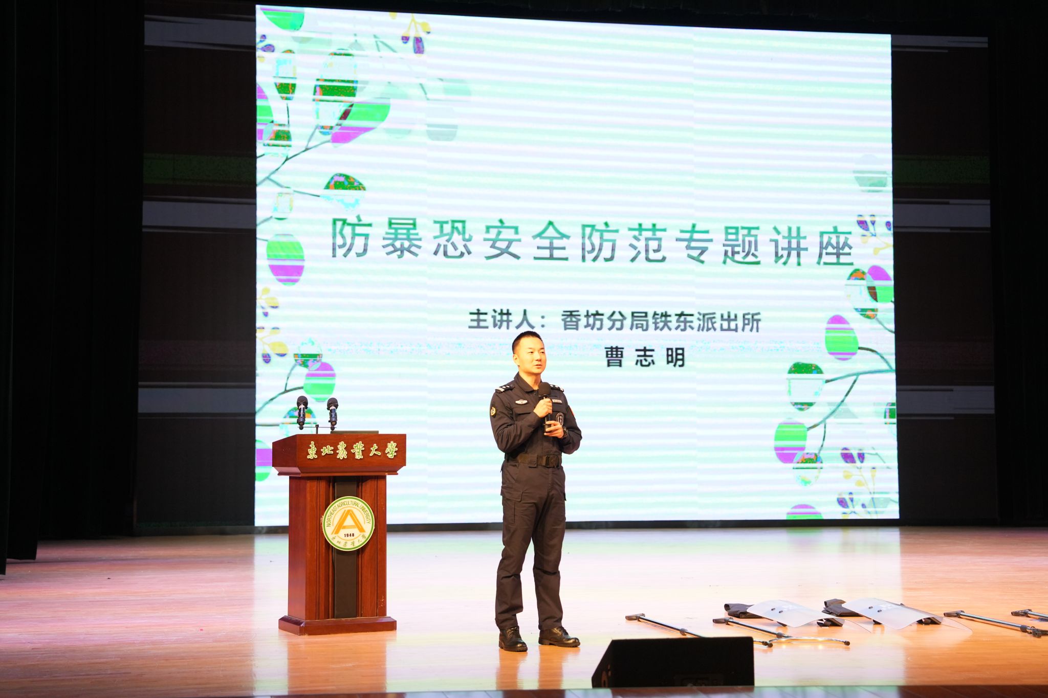 12月4日,保卫处、学生工作部联合属地铁东派出所,在音乐厅开展“东北农业大学防暴恐安全防范专题讲座”。派出所民警曹志明警官以生动形象、图文并茂、学生互动、亲身示范等方式,为师生和校园安保人员进行防暴恐等校园安全知识、防暴恐器材的使用方法和突发紧急事件时如何快速自救、互救及逃生等应急处置注意事项的宣讲。