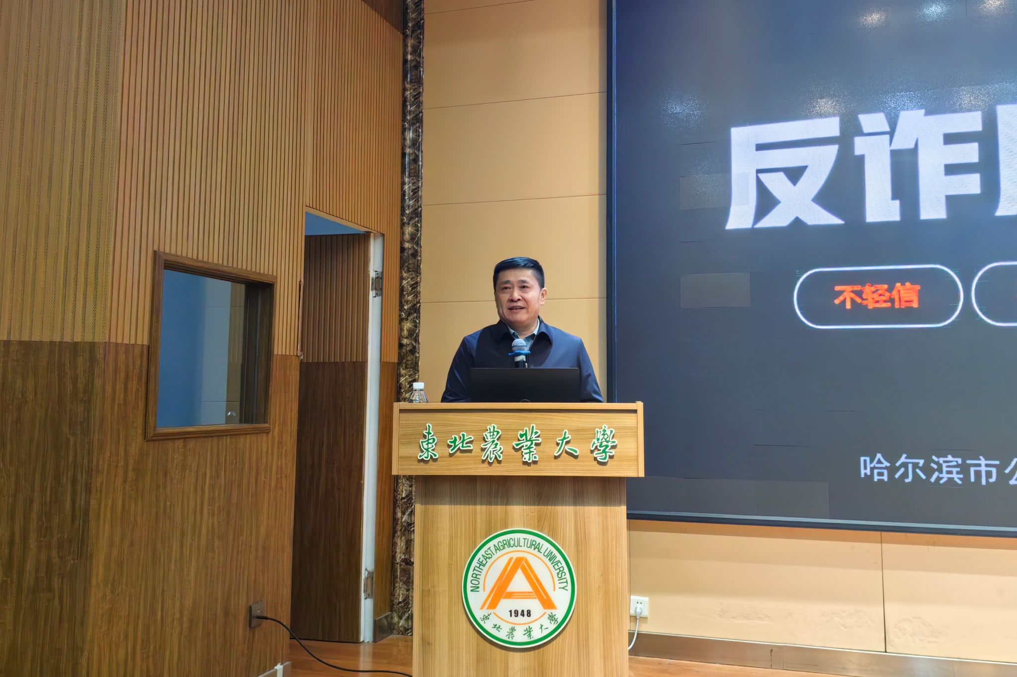 为贯彻落实学校安全工作推进会会议精神,深入开展校园反诈宣传教育,不断提升学生安全意识。12月5日下午,学生工作部联合保卫处邀请哈尔滨市公安局香坊分局安全文化宣讲团,在音乐厅109室举办反诈宣传进校园活动。学生工作部、保卫处工作人员以及各学院学生代表参加活动,活动由学生工作部副部长宫建伟主持。