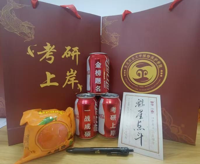 金榜题名,一战成“硕”。学院为每一位考研学子准备了暖心大礼包。橙子寓意心想事“橙”,祝愿每一位考生都能成就梦想,实现自己的理想目标;一张张励志明信片蕴含着对考研学子的美好祝福,希望大家的努力付出都得到好的收获;定制签字笔,祝福大家士气如虹,从容提笔,一举夺魁;定制可乐,为大家带来好运,愿各位成绩可喜,生活“可乐”!