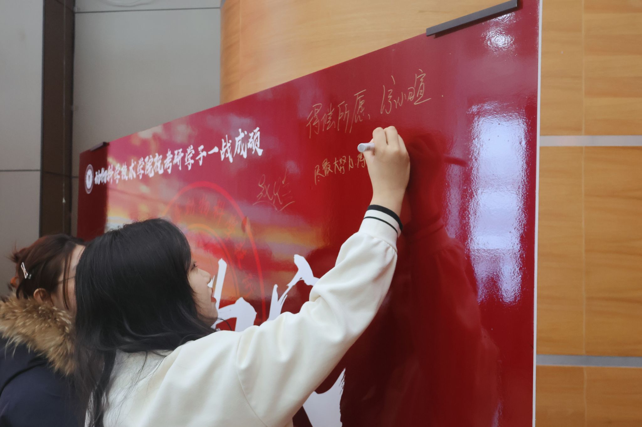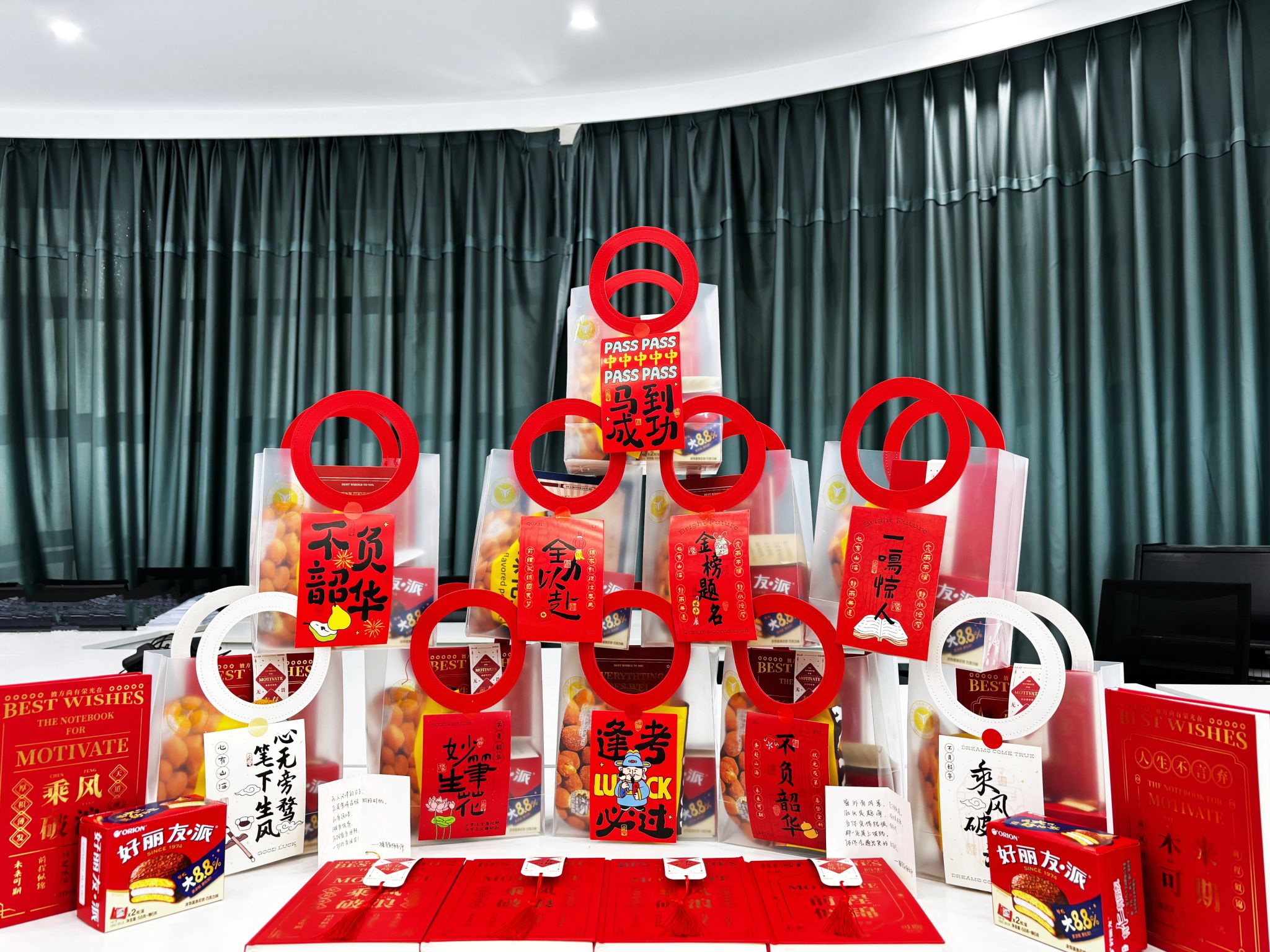学院为考研学子精心准备了“上岸锦囊”礼包。花生坚果礼寓意“好事发生”,“好丽友”甜品礼寓意学院与大家一起温暖同行、“研”途不孤单,并为考研学子定制了带有“金榜题名”“未来可期”字样的励志笔记本,每个福袋中还有辅导员为考研学子书写的专属寄语卡片。活动现场设置了“上岸签名墙”,考研学子们纷纷在墙上写下自己的梦想与祝福,为自己加油打气。大家纷纷表示,在最后的备战时刻,收到来自学院的关心和关爱倍感温暖,更加坚定了自己考研必胜的信心,在最后的冲刺阶段一定会全力以赴。