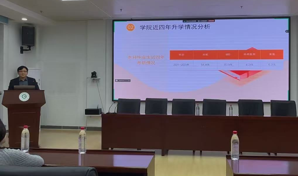 科学规划,步步为赢。12月12日,学院召开2026届考研备考动员会。会上,孙涛介绍了近三年学院毕业生的就业情况,让与会同学了解所学专业未来的就业岗位和待遇,为与会学生树立了就业信心,引导学生要科学理性做好就业与升学的选择。在介绍升学情况时,他对学院2024届毕业生考研数据进行了详细分析,强调学生一要做好自我评估,坚定考研的决心。二要合理化报考预期,确定好符合自身实际的目标院校。三要充分掌握目标院校的报考要求,制定科学合理的备考计划,确定好时间进度表。四要做好思想准备,做到千磨万砺、永不言弃。王金峰以导师和专家的视角就考研院校专业选取、导师选择以及正确认识研究生科研学习工作等方面提出了意见和建议,并介绍了学院各科学专业研究生招生和培养的情况。最后,考取本校和985院校的三名学生代表分享了备考策略与学习方法。