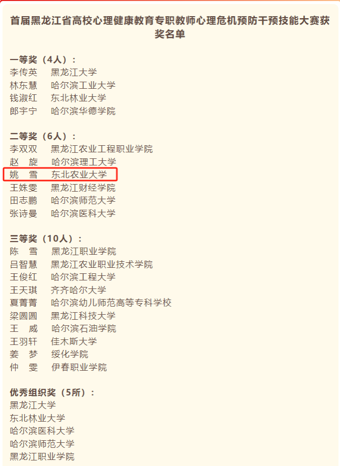 近日,由黑龙江省教育厅主办的第一届黑龙江省高校心理健康教育专职教师心理危机预防干预技能大赛暨观摩培训活动圆满落幕,来自全省高校60余名心理健康教育专职教师参赛。大赛设置心理危机干预专业知识测试、案例分析和模拟干预三个环节,全面考察心理健康教育专职教师心理危机识别、评估、干预等综合能力。经过为期三天的激烈角逐,我校学生工作部心理健康教育中心专职教师姚雪凭借扎实的专业知识和出色的实践技能,在比赛中荣获二等奖。