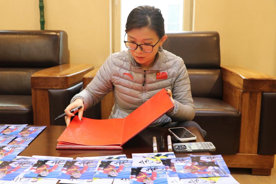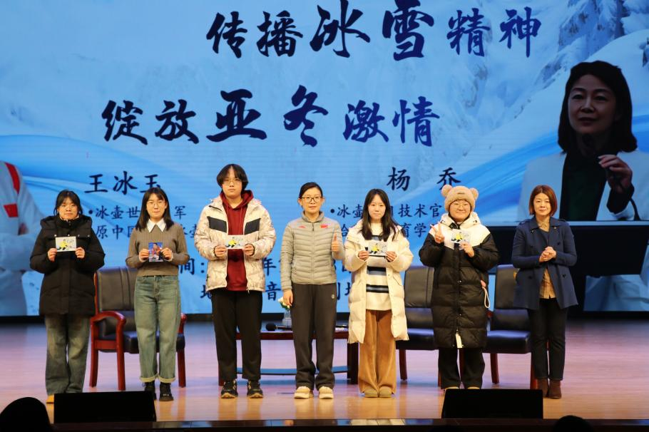 为增加同学们的参与度与现场的氛围感,现场设置抽奖环节。会前,王冰玉在个人授权照片上进行签名,会议现场抽取幸运学生,将奥运冠军签名照作为礼物现场发放给大家,激励同学们热爱体育运动,绽放青春活力,与会学生代表为王冰玉、杨乔献花。