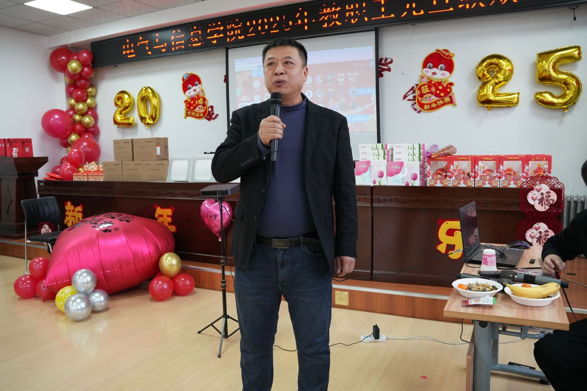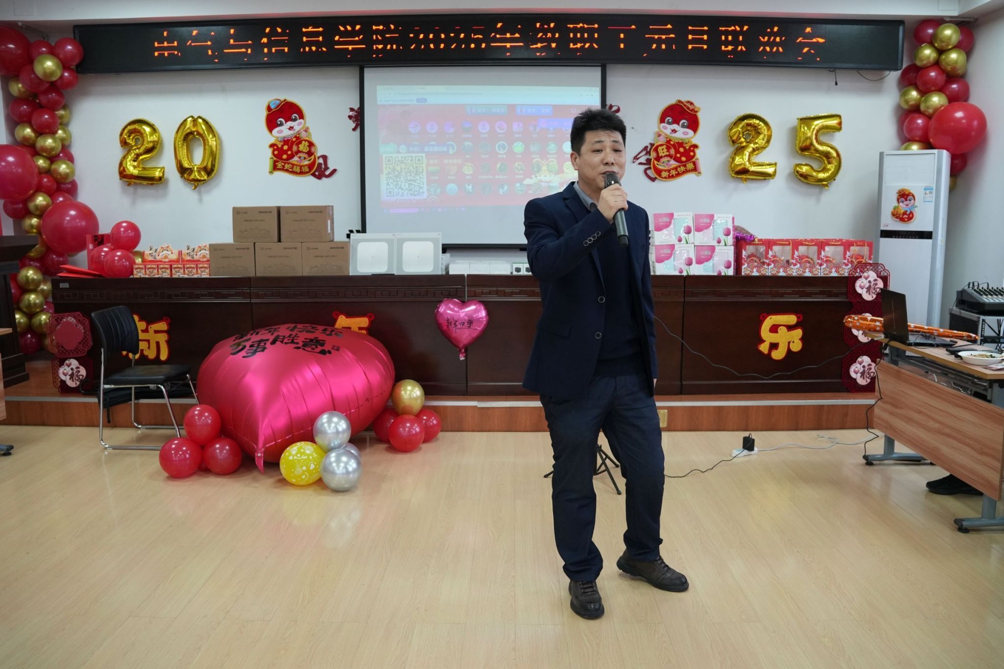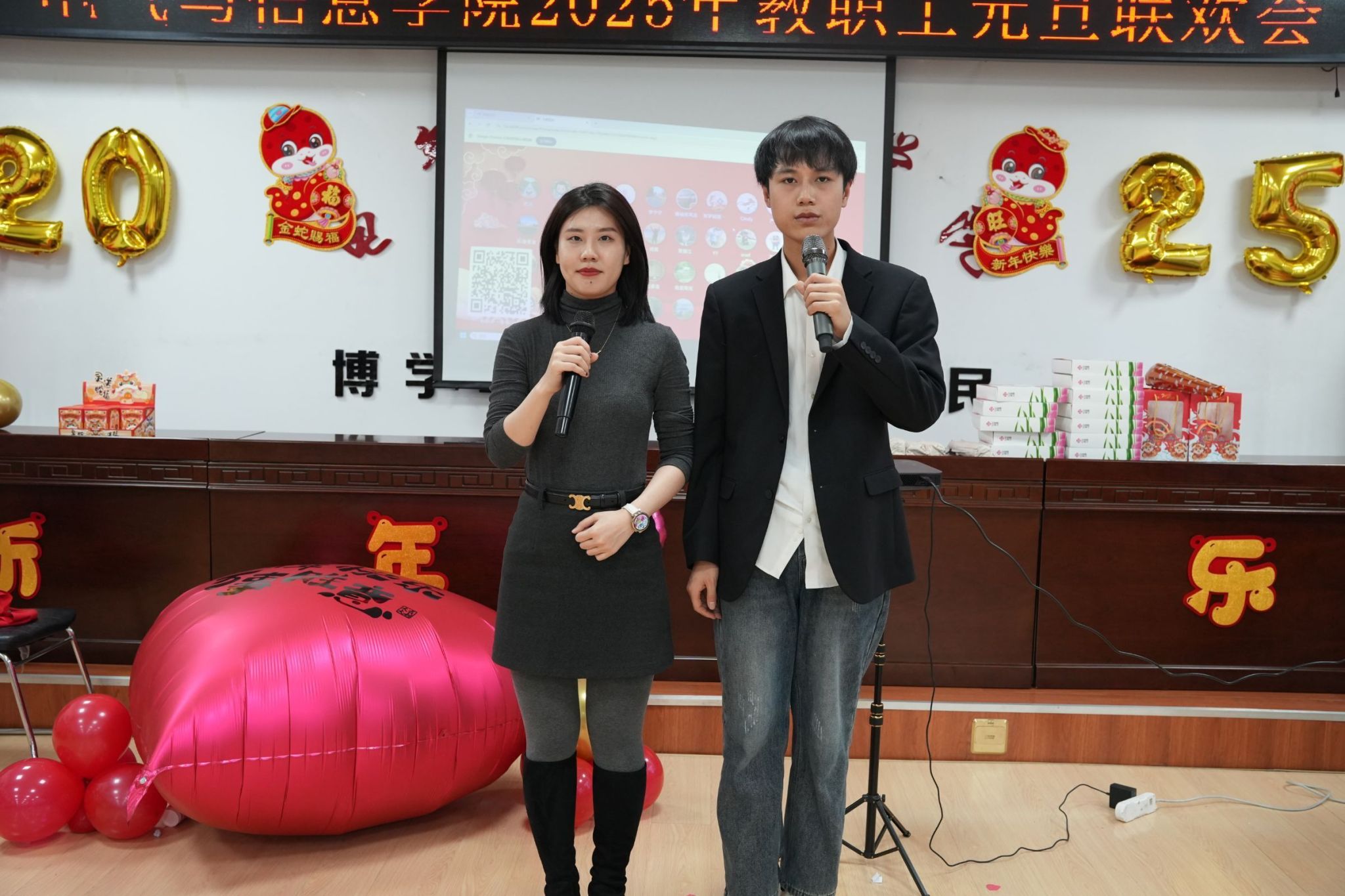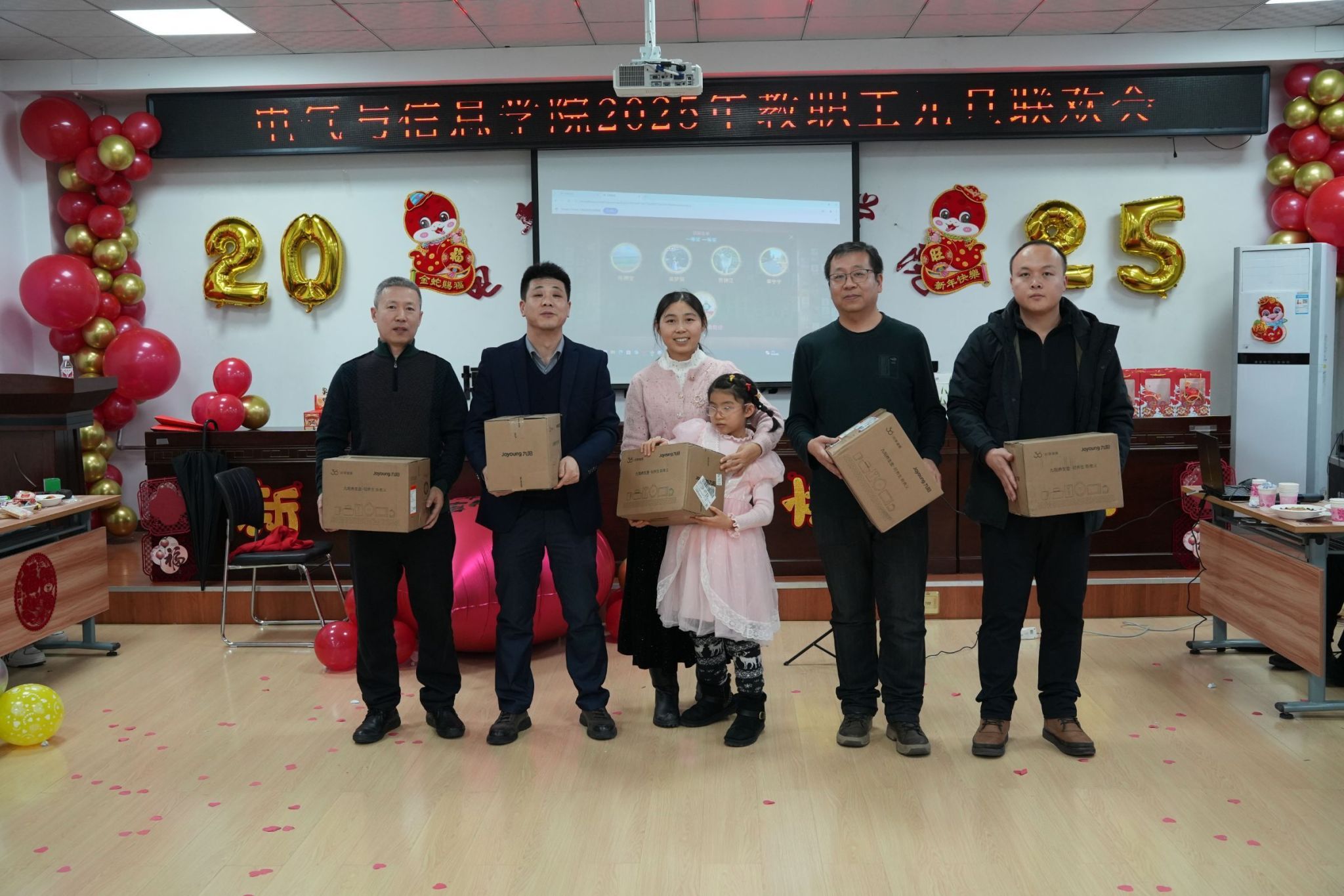 各系部教师表演的节目精彩纷呈。教师谭克竹独唱《家和万事兴》,高睿、代昕、曹玉莹表演舞蹈《青苹果乐园》给大家带来了欢声笑语;汪文斌独唱《像我这样的人》,引来场下阵阵的掌声。付强、赵语合唱《风再起时》感受久违的清风,带大家重返那风起云涌的年代;物联网工程系全体教师,通过播放视频的方式为大家送上了节日的美好祝福;学生工作办公室王丽萍、牛牧原带来合唱《上海滩》,点燃全场观众的热情;联欢会的最后,学院领导班子带来诗朗诵:《你好!2025》。学院党委书记万庆生、行政负责人戴百生为本命年教职工赠送了礼物。