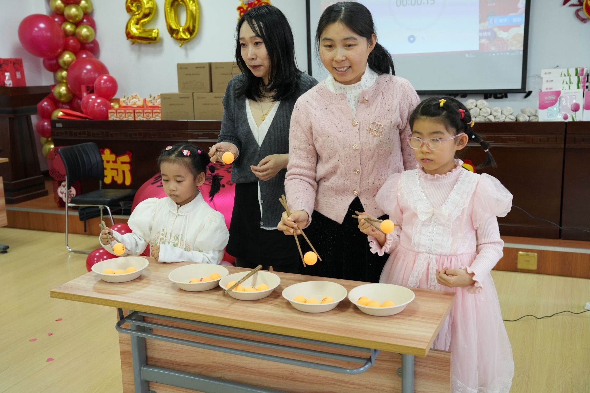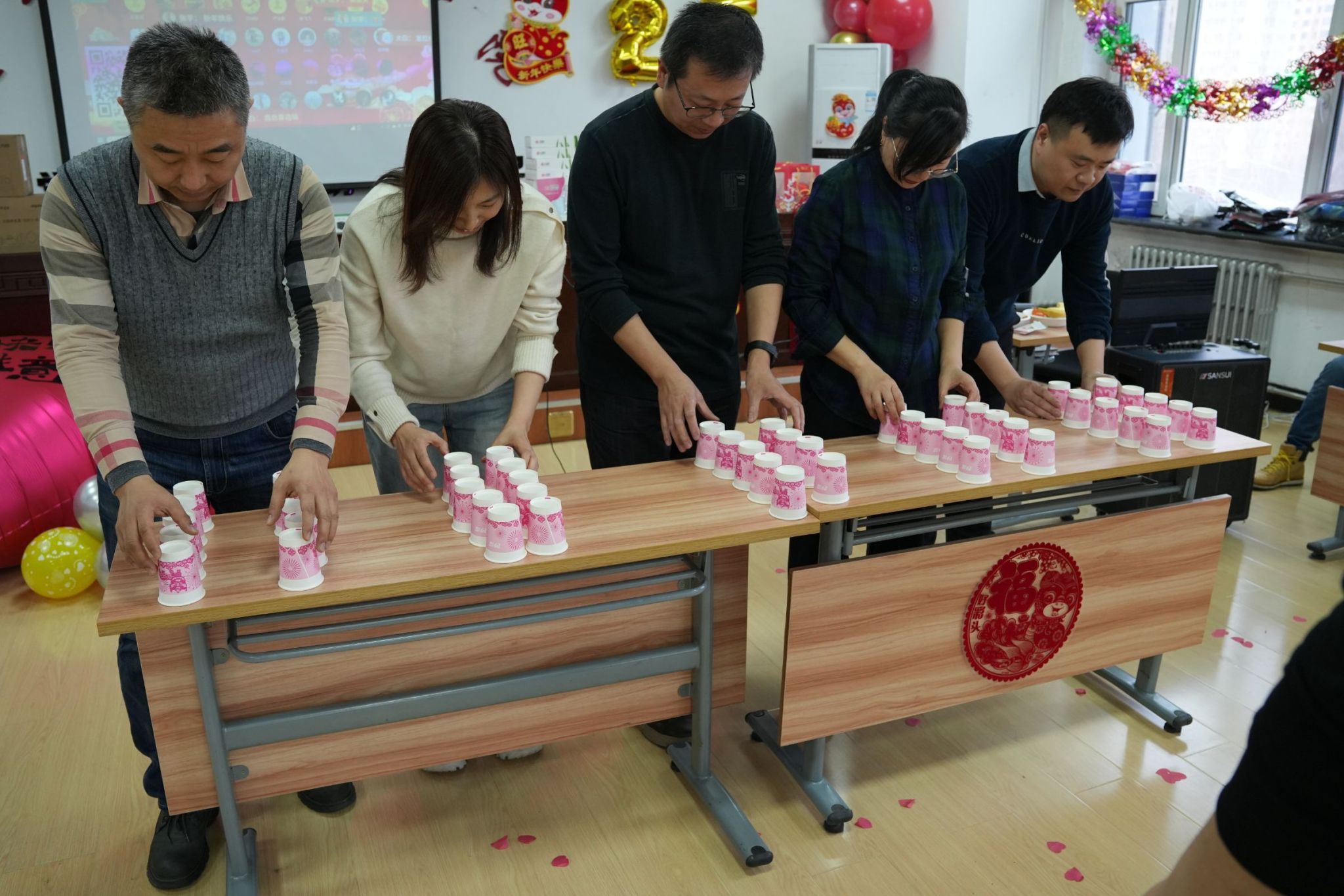 叠纸杯速决、筷子夹乒乓球、双人投篮、数字炸弹比赛等游戏环节高潮迭起,抽奖环节内容丰富多彩,形式活泼有趣,引来阵阵欢声笑语。