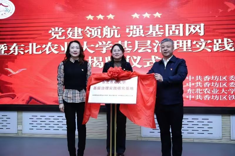 近日,以“党建引领,强基固网”为主题的东北农业大学基层治理实践研究基地揭牌仪式在我校举行。香坊区委社会工作部部长张宏燕、铁东街道工委书记张立君、铁东街道办事处主任许向红、铁东街道工委副书记李宏峰、铁东街道工委副书记兼铁东派出所所长金鹏吉、铁东街道工委挂职副书记杨宇庭等铁东办事处100余名街道干部和社区工作人员参加会议,我校公共管理与法学院副院长程镝参加揭牌仪式。