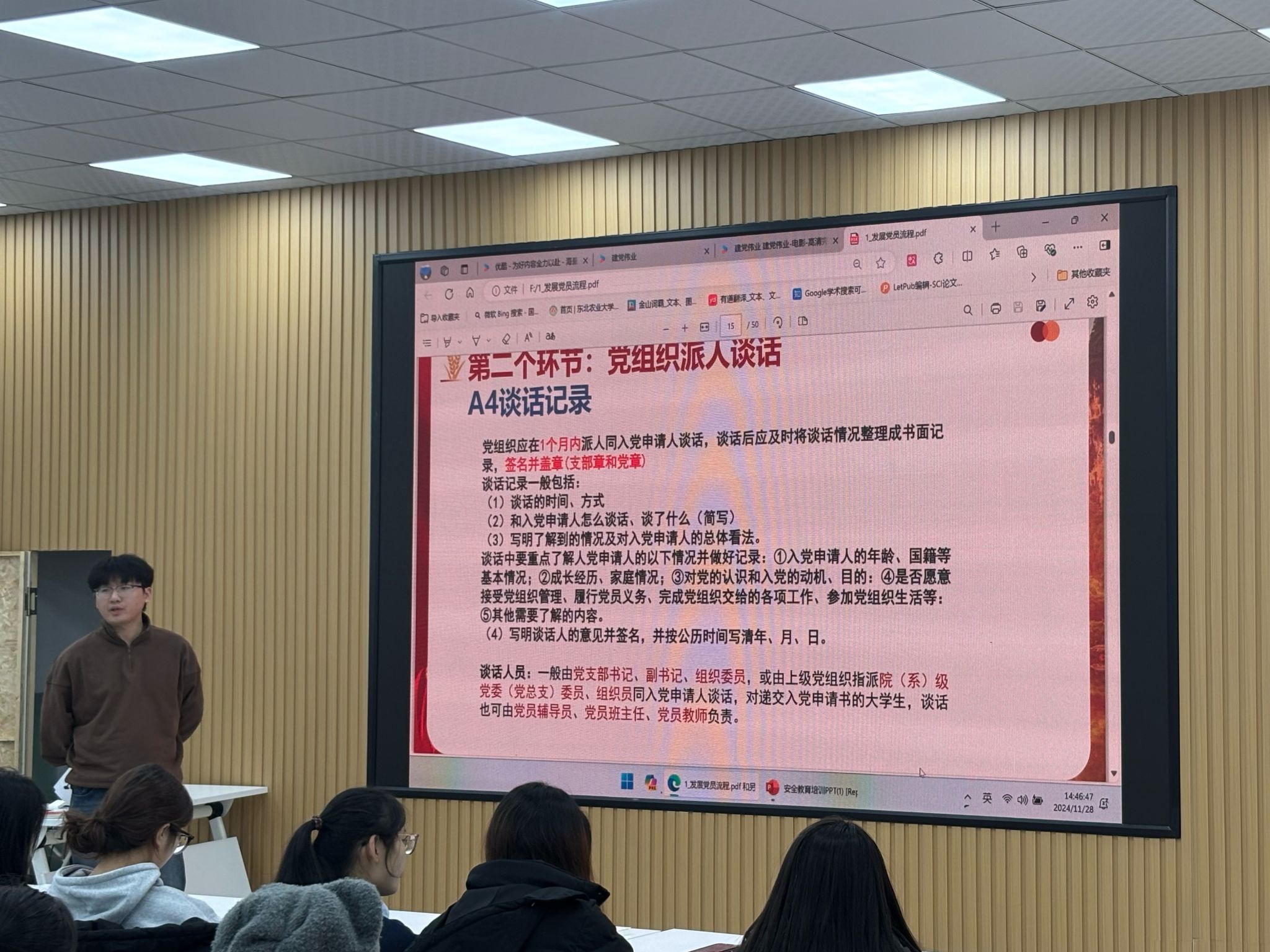 10月25日,学院副处级辅导员张李滨为全体新生讲授“开学第一课”,他鼓励2024级全体研究生要树立远大理想、练就过硬本领、不断提高自己的专业素养和能力。要求学生要珍惜研究生阶段的学习机会,积极参与科研项目和社会实践,努力成为具有创新精神和实践能力的高素质人才。11月28日,学院党建办公室指导教师苏美英男为全体入党积极分子开展专题培训,他讲解了党员的基本条件、发展程序以及新时期党员发展方针,使同学们明确了发展方向、目标和发展流程,通过培训也进一步强化了入党积极分子的党性教育,夯实了理论基础,端正了入党动机。培训会后全体入党积极分子观看了电影《建党伟业》。