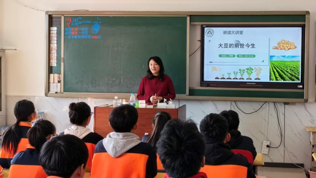 在花园镇中学八年四班,常缨以《大豆的前世今生》为题,从大豆的起源、生物学特征与生长习性、我国大豆产业的发展、基因编辑大豆育种技术等角度,为学生们讲授了一堂生动且深刻的科普思政课程。学生们认真听讲、积极参与互动,得到了师生的一致好评。