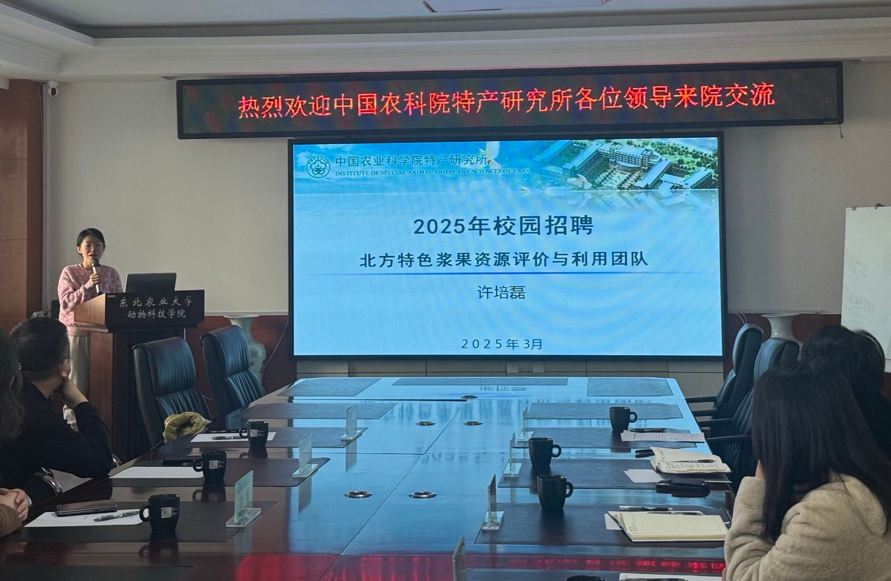 3月18日,中国农业科学院特产研究所党委副书记田欣、“特种动物疫病防控团队”首席白雪、“北方特色浆果资源评价与利用团队”执行首席许培磊一行到我校动物科学技术学院开展高层次人才引进宣讲,动物科学技术学院行政负责人董娜、党委副书记焦阳、副处级辅导员张海、动物生产系教授杜智恒及毕业年级研究生参会。会议由董娜主持。