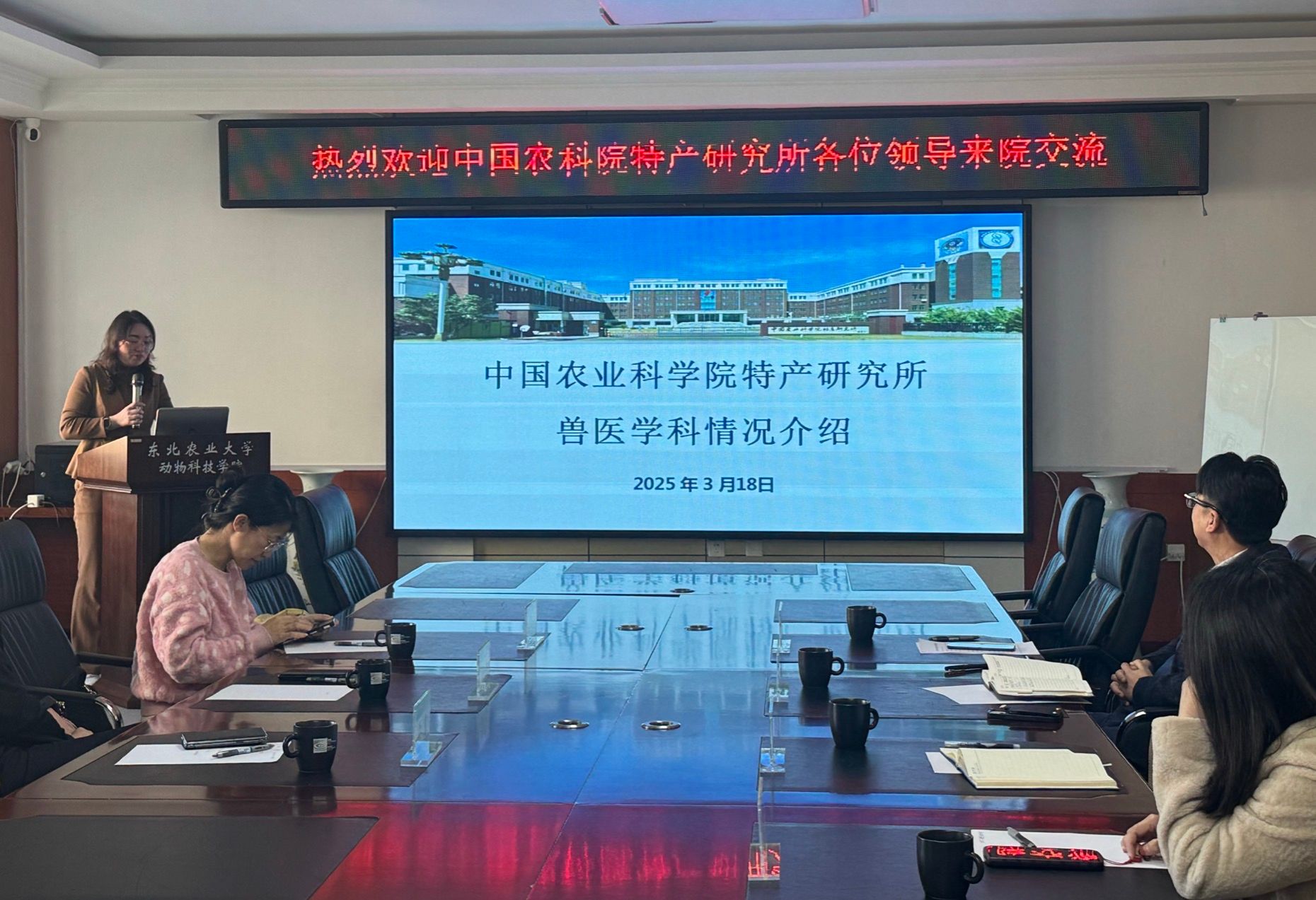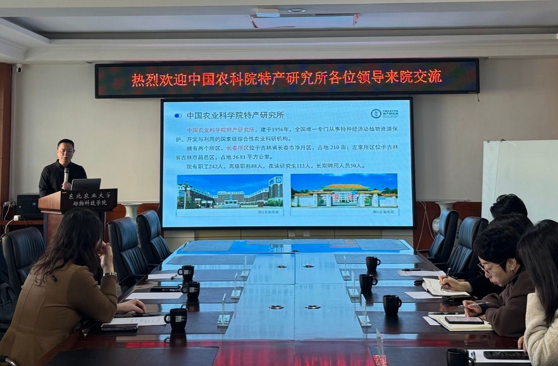 董娜对中国农业科学院特产研究所一行的到来表示热烈欢迎,她介绍了动物科学技术学院的历史沿革、产业转化、办学现状以及学院学科建设等基本情况。焦阳介绍了动科学院研究生就业情况及在校博士生培养情况。