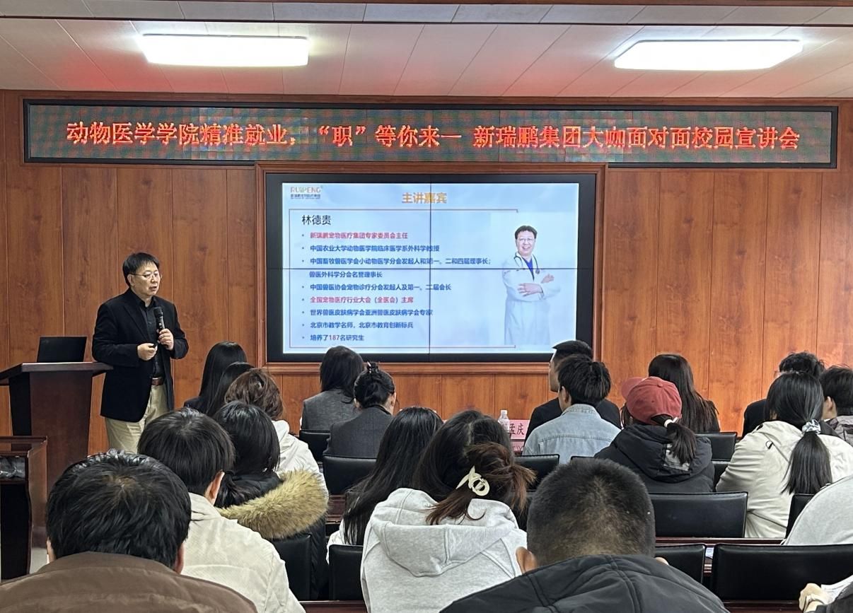 为促进校企合作交流,凝聚协同育人力量,提高人才培养与社会需求的契合度,帮助学生树立正确的职业观,3月21日,动物医学学院联合新瑞鹏宠物医疗集团在临床楼215会议室举办“精准就业,‘职'等你来”新瑞鹏集团大咖面对面校园宣讲会。新瑞鹏集团专家委员会主任林德贵、集团招聘高级经理李娇、上海区运营总监孟庆龙、东北区人资经理史东瑞、大湾区招聘专业主管张洪涛、学院全体辅导员、本科生和研究生代表参加会议。会议由学院党委副书记张鑫琳主持。