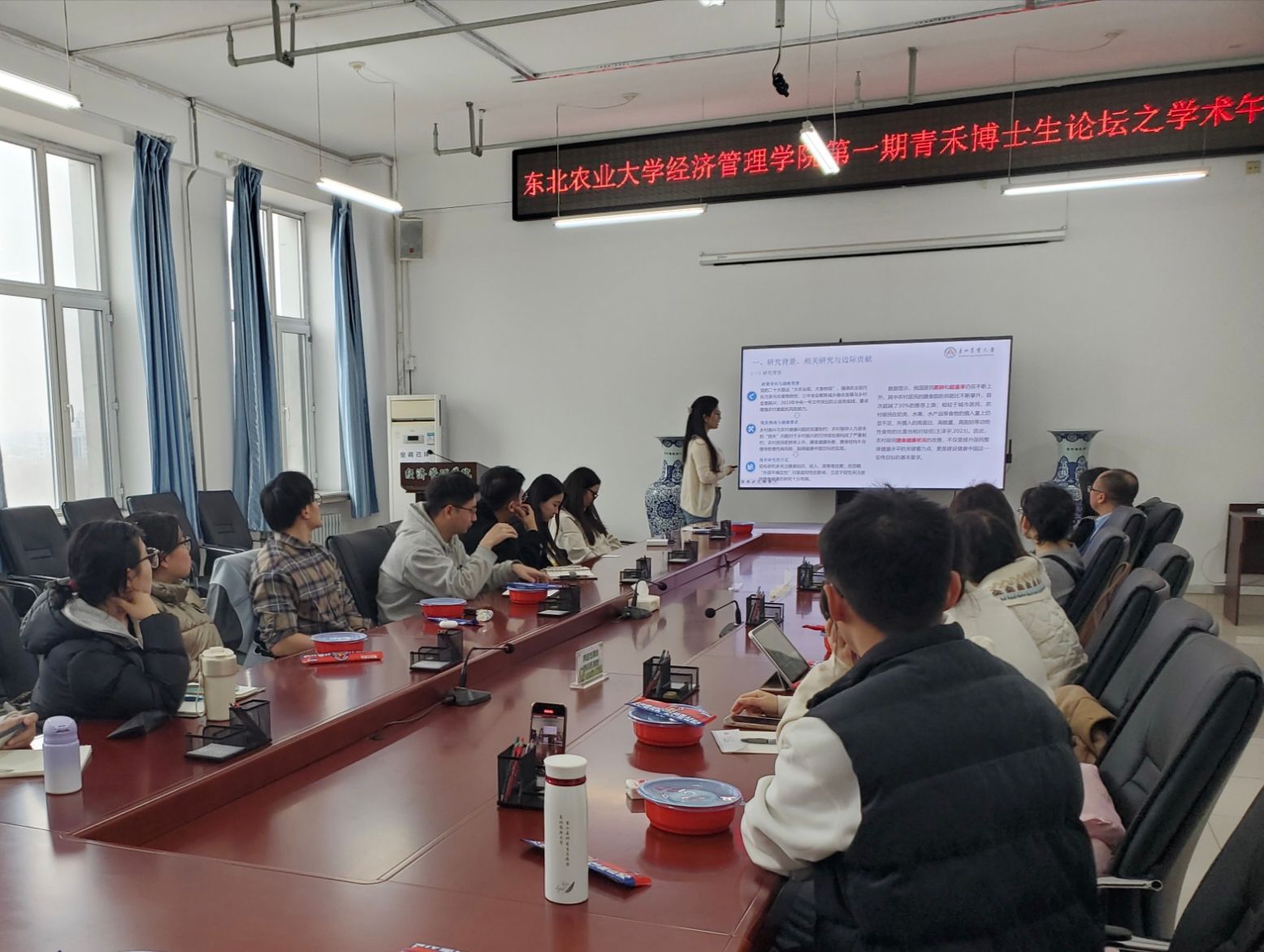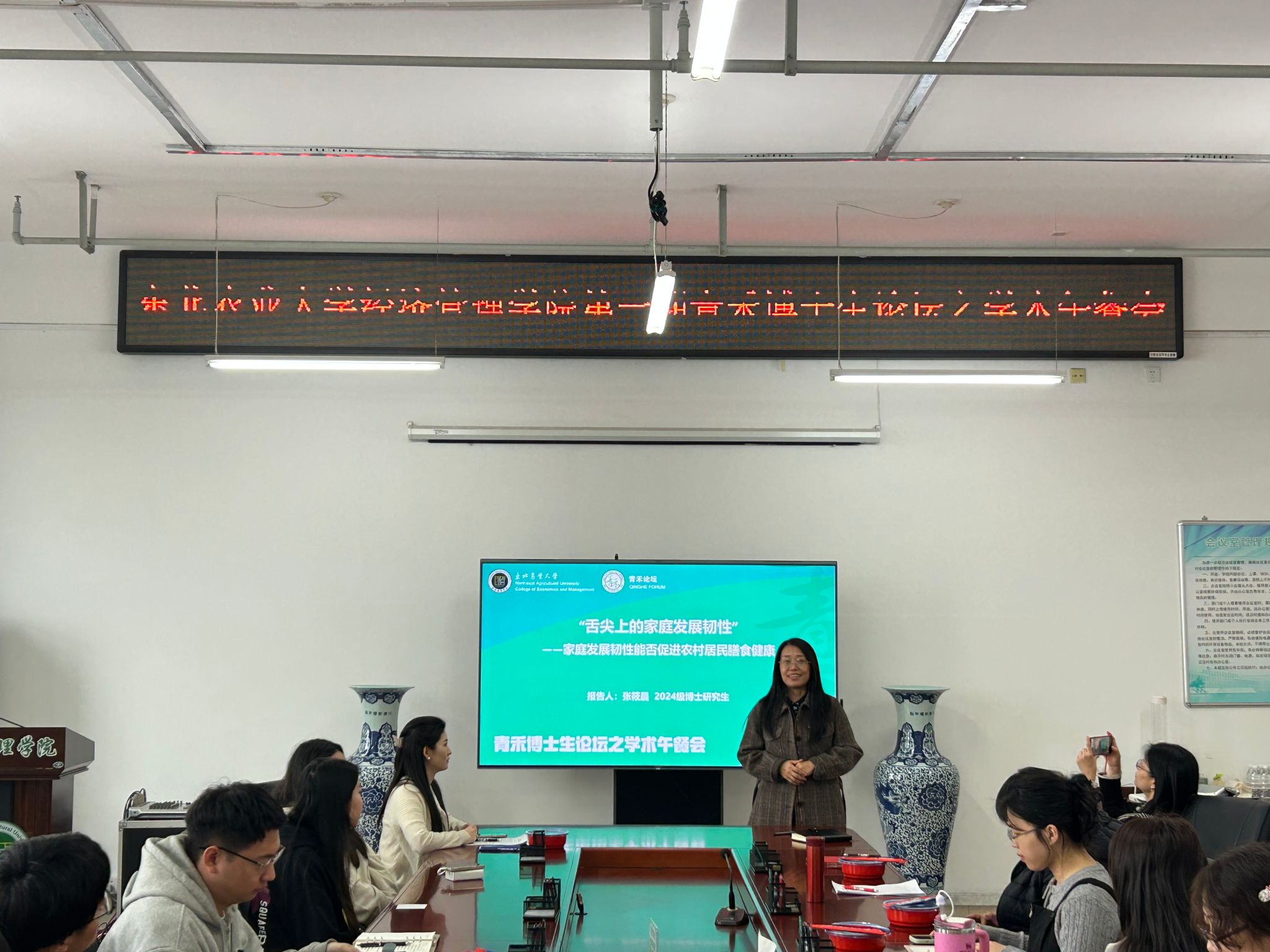 为贯彻落实学校第四次党代会精神,聚焦构筑高质量育人体系要求,3月25日,经济管理学院首期青禾博士生论坛之学术午餐会在成栋楼710会议室举行。本次午餐会邀请学院2024级博士研究生张筱晨以《“舌尖上的家庭发展韧性”——家庭发展韧性能否促进农村居民膳食健康》为题进行分享。经济管理学院正处级辅导员孙珠红,副院长王刚毅、王洋,农经系教师姜冰、许佳彬出席活动,20余位研究生参加活动。活动由王洋主持。