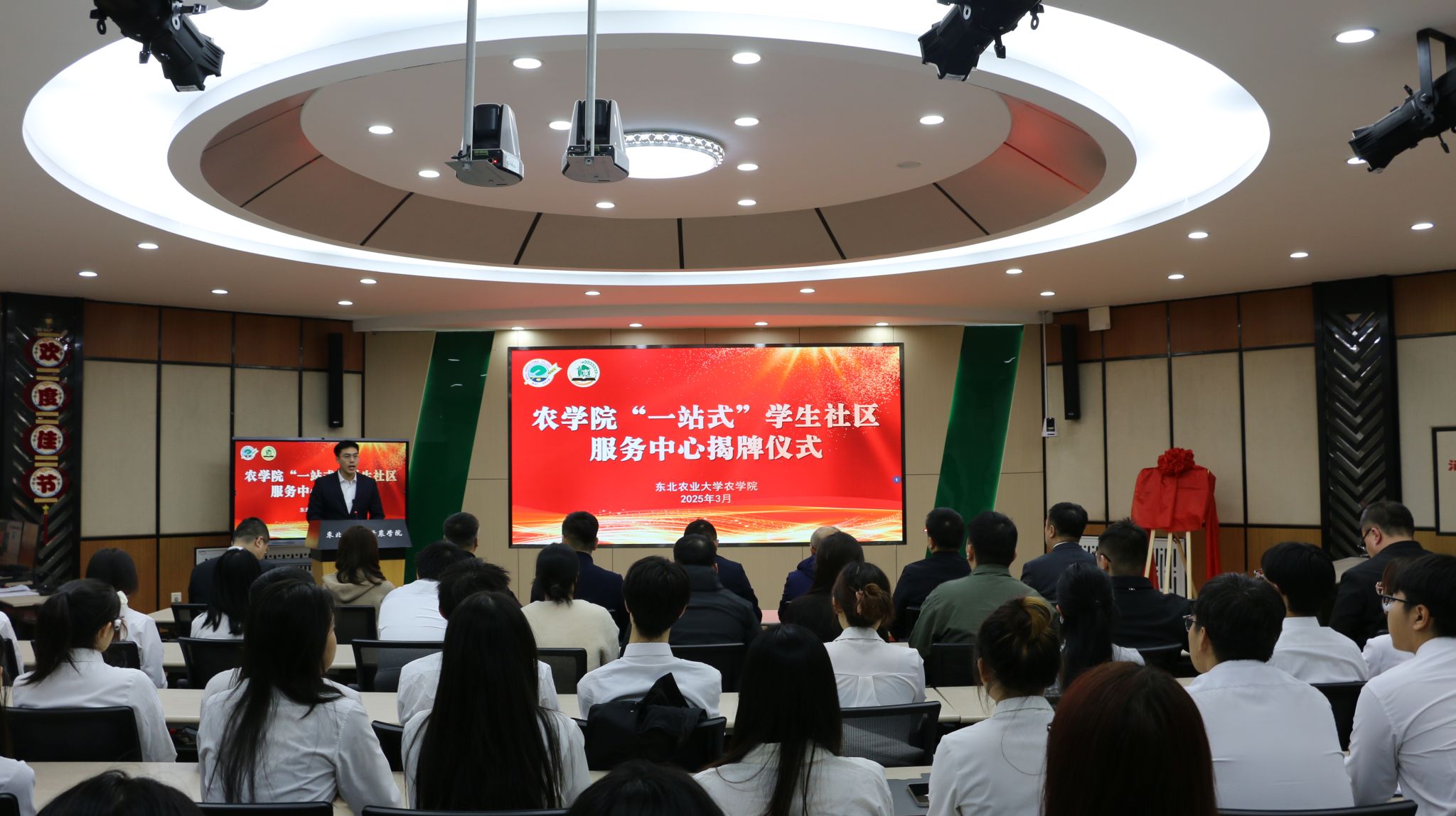 仪式现场,农学院副处级辅导员李东宣读了《关于成立东北农业大学农学院“一站式”学生社区服务中心的决定》,标志着学院育人阵地建设进入新阶段,正式拉开学生社区改革创新的序幕,切实推动教育管理服务力量下沉,实现从治理“末梢”向育人“前哨”的转变。农学院党委副书记马涛系统阐述建设实施方案,强调要将学生社区打造成为党建引领新高地、学风建设主阵地、成长服务集聚地。方案提出要持续深入六项工作扎根一线,即“先锋示范深入一线、日常管理强在一线、健康服务驻到一线、学业支持走到一线、职业领航干在一线、耕读文化融入一线”,打通思政育人阵地“最后一公里”。