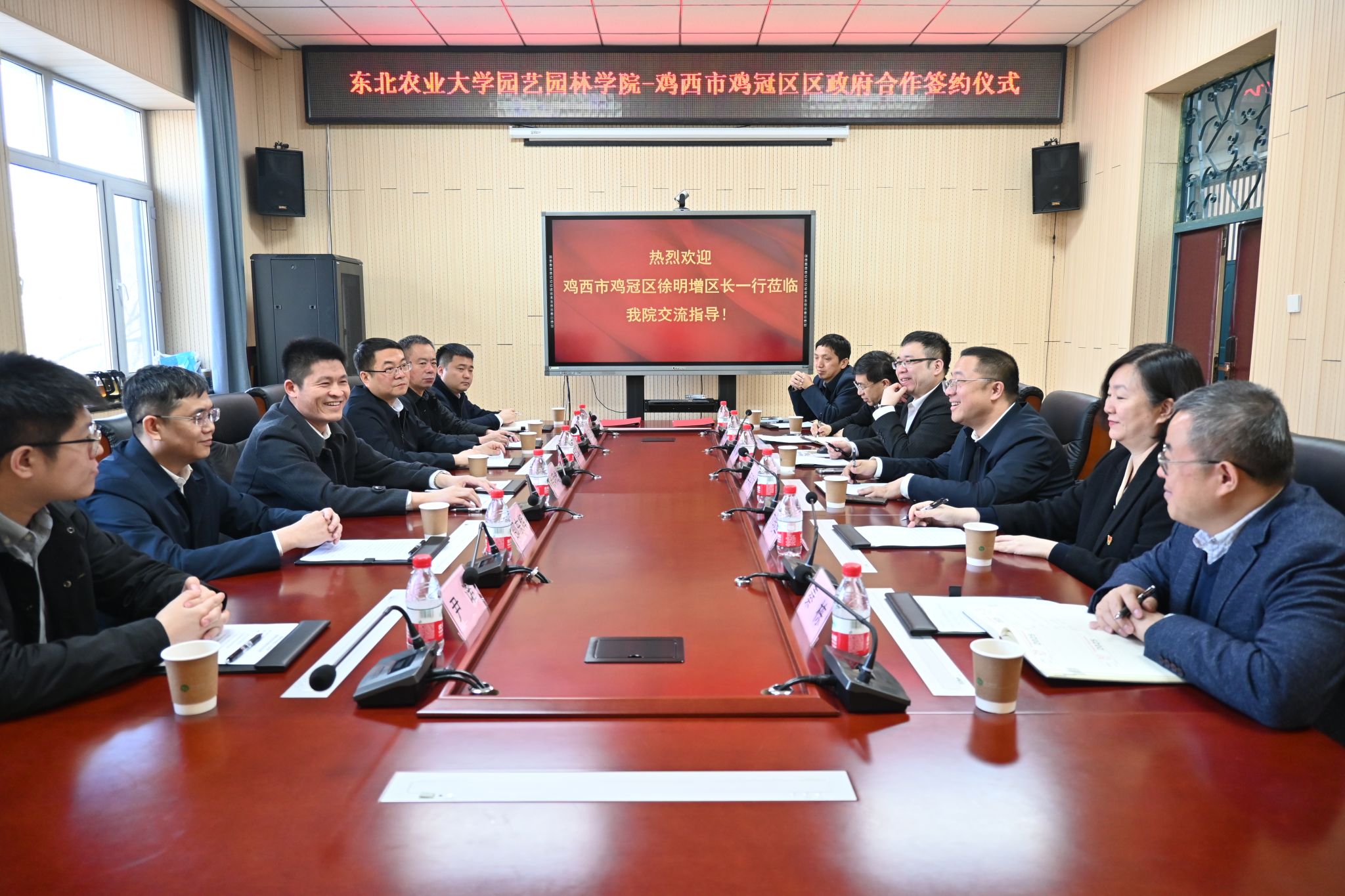 签约仪式上,高鹏和徐明增代表双方签订了乡村振兴合作协议。双方对未来共创“东北农大—鸡冠区乡村振兴协同创新中心”,联合申报乡村振兴重点项目,构建长期稳定、互惠共赢的校地合作机制进行了深入探讨和交流。下一步,学院将结合鸡冠区的产业需求,派出专家团队,院地通力合作,共同打造校地合作“东农范式”社会服务“园艺模式”。