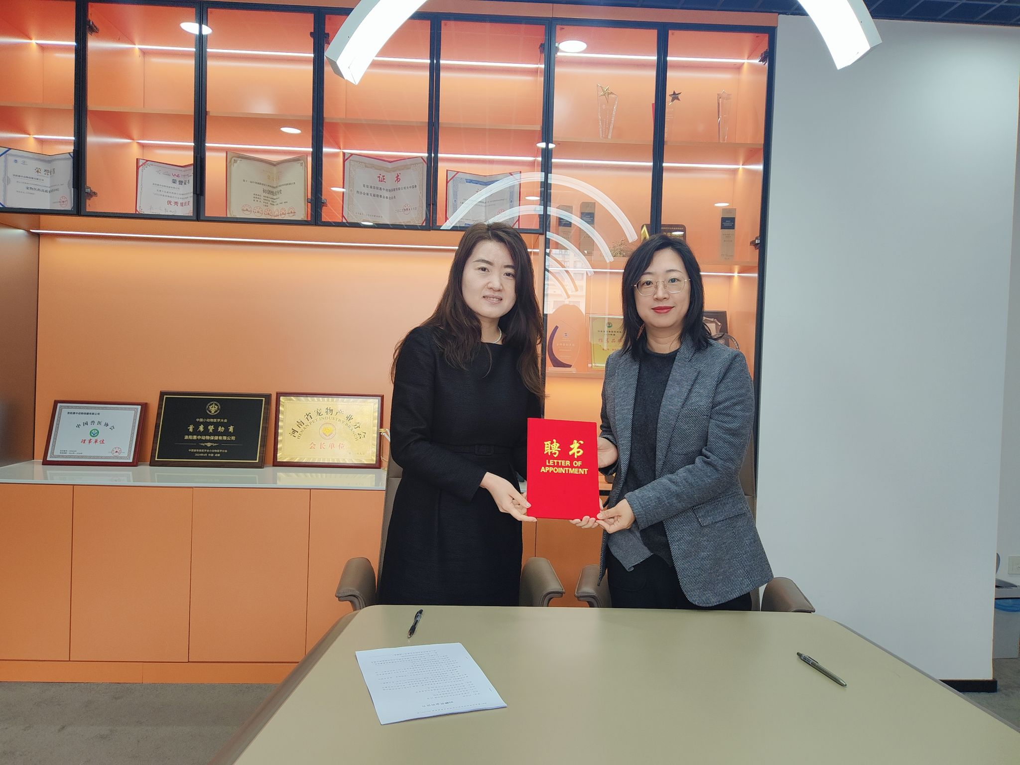 在洛阳惠中动物保健有限公司,学院一行与我校校友、企业总经理刘玉秀座谈交流。双方就兽药行业发展趋势、人才培养模式等问题交换意见并现场签署“刘玉秀奖学金”捐赠协议,张鑫琳为刘玉秀颁发“就业创业导师”聘书。