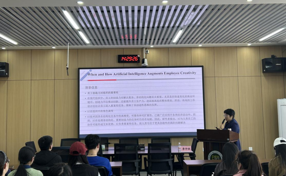 李仲秋带领在场师生共同精读《When and How Artificial Intelligence Augments Employee Creativity》,深入探讨其研究框架、理论贡献和方法设计,并强调研究方法的透明性与问题导向的创新,是本文入选顶级期刊《Academy of Management Journal》的关键。现场氛围热烈,学生们积极提问,并就文献中的难点问题进行了深入探讨。