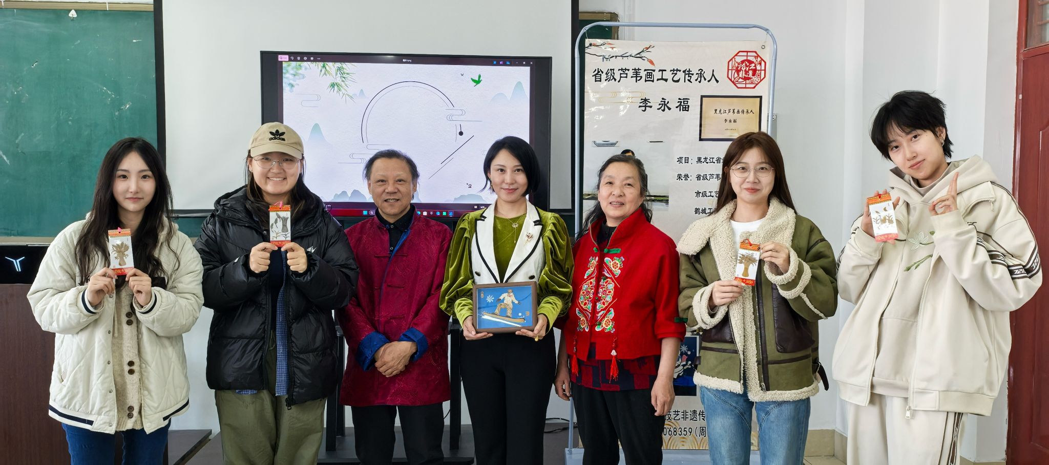 本次课程邀请到黑龙江省级芦苇画非遗传承人李永福、隋广莲为同学们讲解芦苇画的非遗文化。课堂上,李永福、隋广莲详细介绍了芦苇画的起源、发展历程以及制作工艺,让大家对芦苇画这一非物质文化遗产有了更深入的了解。通过专业的讲解,学生们不仅领略到了芦苇画的艺术之美,更感受到了非物质文化遗产背后深厚的文化底蕴。互动环节,学生们纷纷动手尝试制作芦苇画。在两位老师的指导下,学生们完成了挑选芦苇、剪裁、粘贴、制画等环节,一幅幅精美的芦苇画作品诞生。