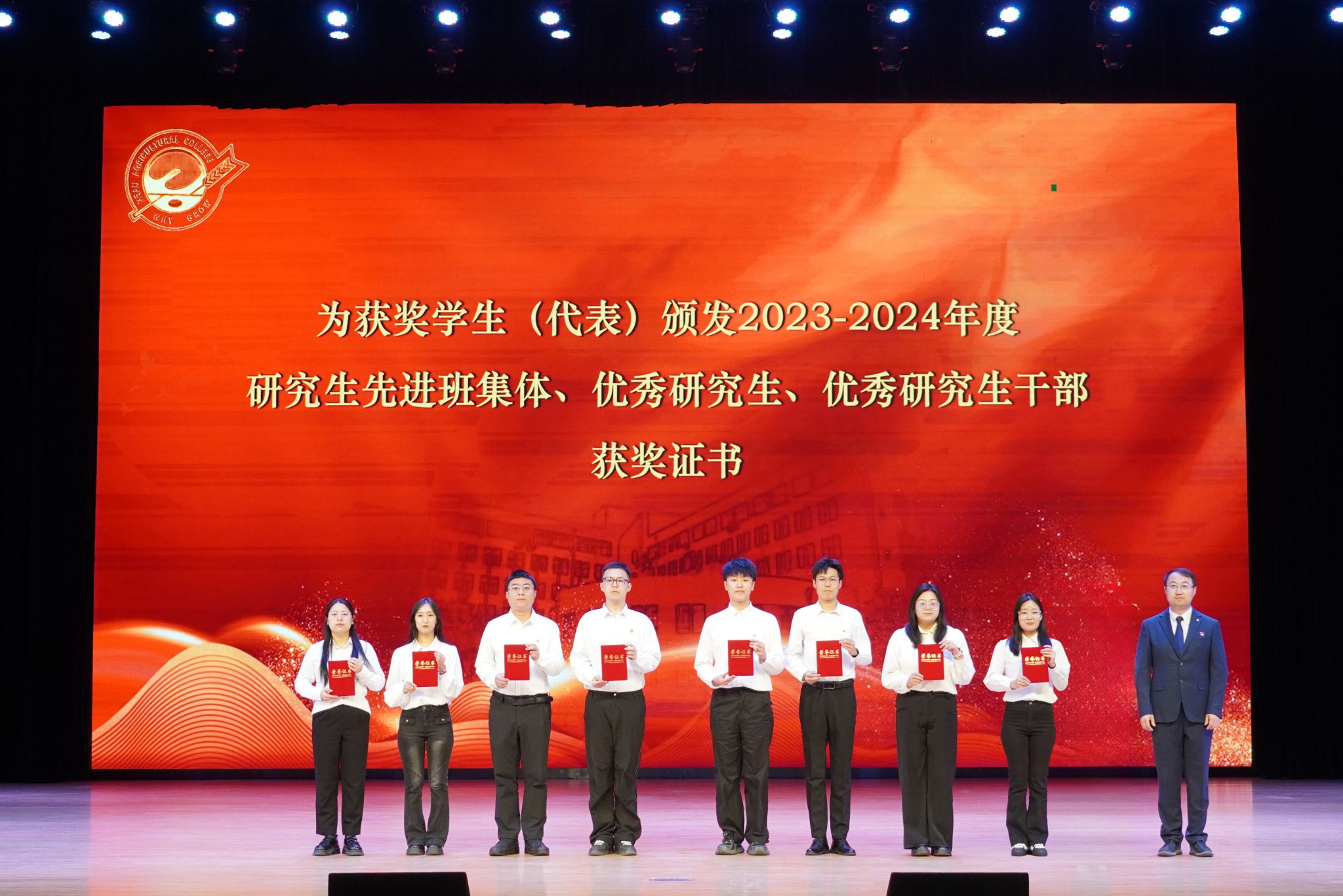 农学院副院长刘鑫宣读《关于表彰奖励2023—2024学年度研究生先进班集体、优秀研究生、优秀研究生干部的决定》,并为获奖学生颁奖。
