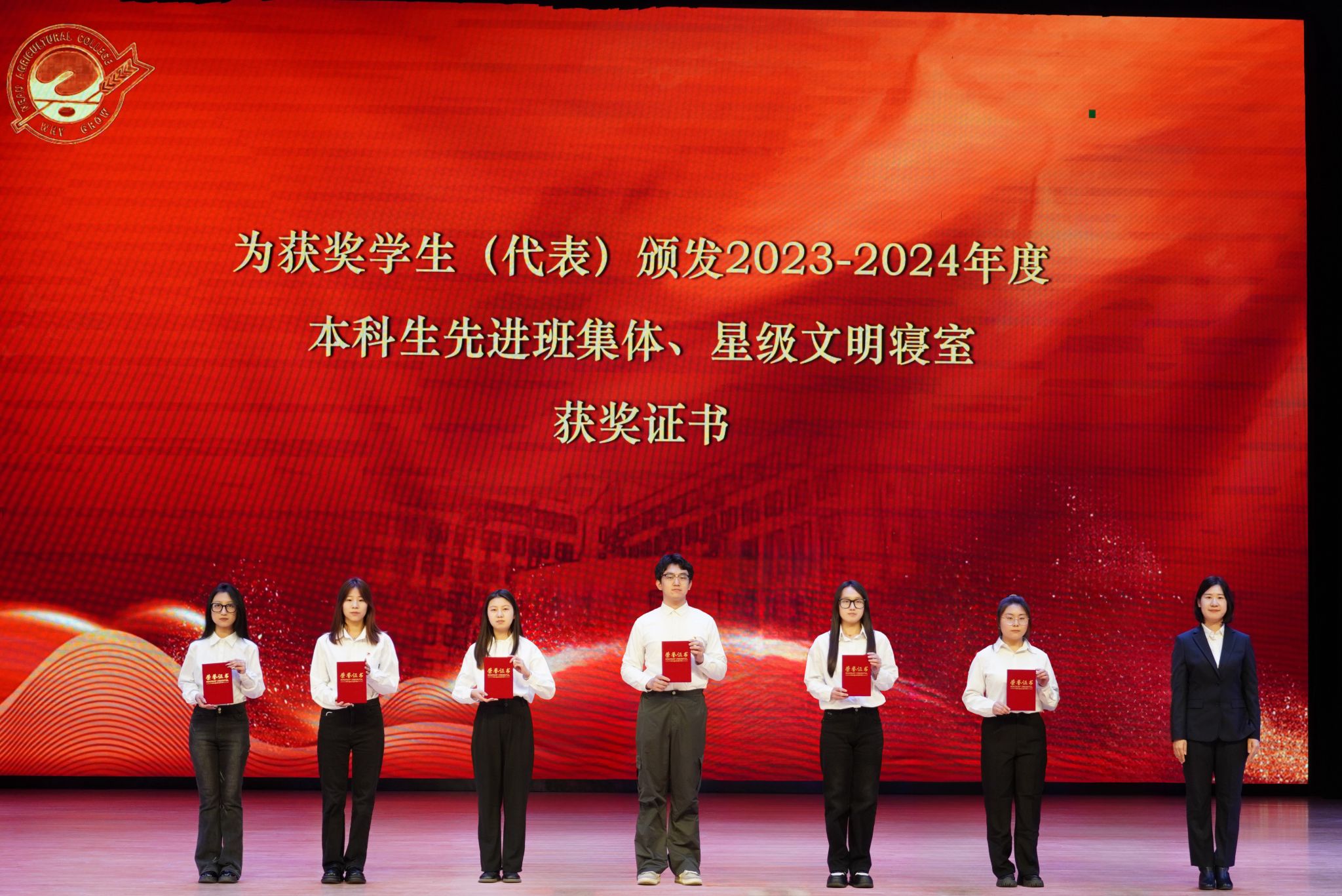 农学院学生工作办公室主任刘丹宣读《关于表彰2023—2024学年度本科生先进班集体的决定》《关于表彰2023—2024学年度星级文明寝室的决定》,并为获奖学生颁奖。