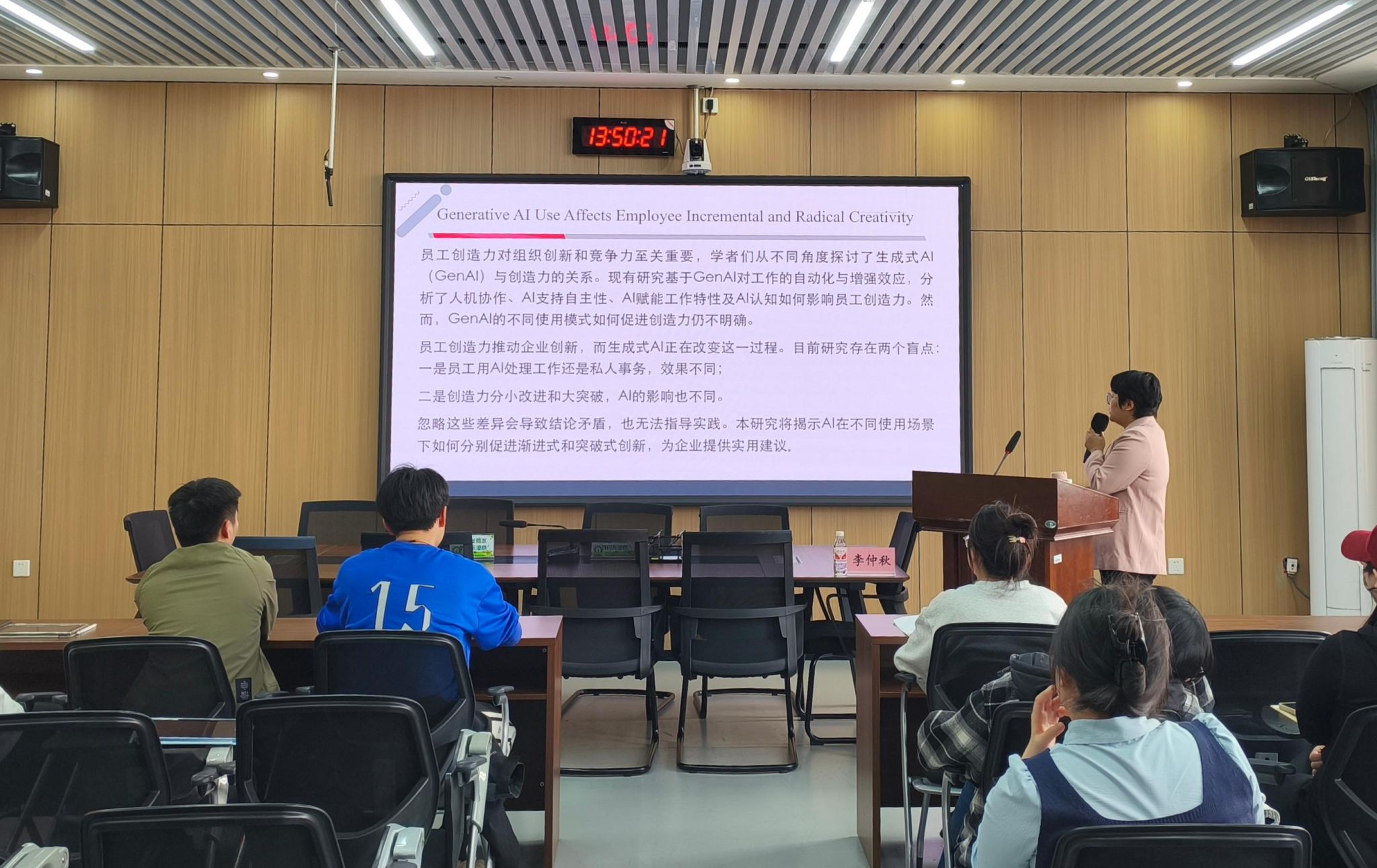为深化研究生科研素养培养,促进学术思想碰撞与创新,4月23日,经济管理学院第二期青禾经典文献研读在成栋楼720会议室举办。本次活动特邀经济管理学院副教授李仲秋,围绕论文 《How and when generative Al use affects employeeincremental and radical creativity》展开深度研讨,经济管理学院副院长王洋,10余名研究生参会。